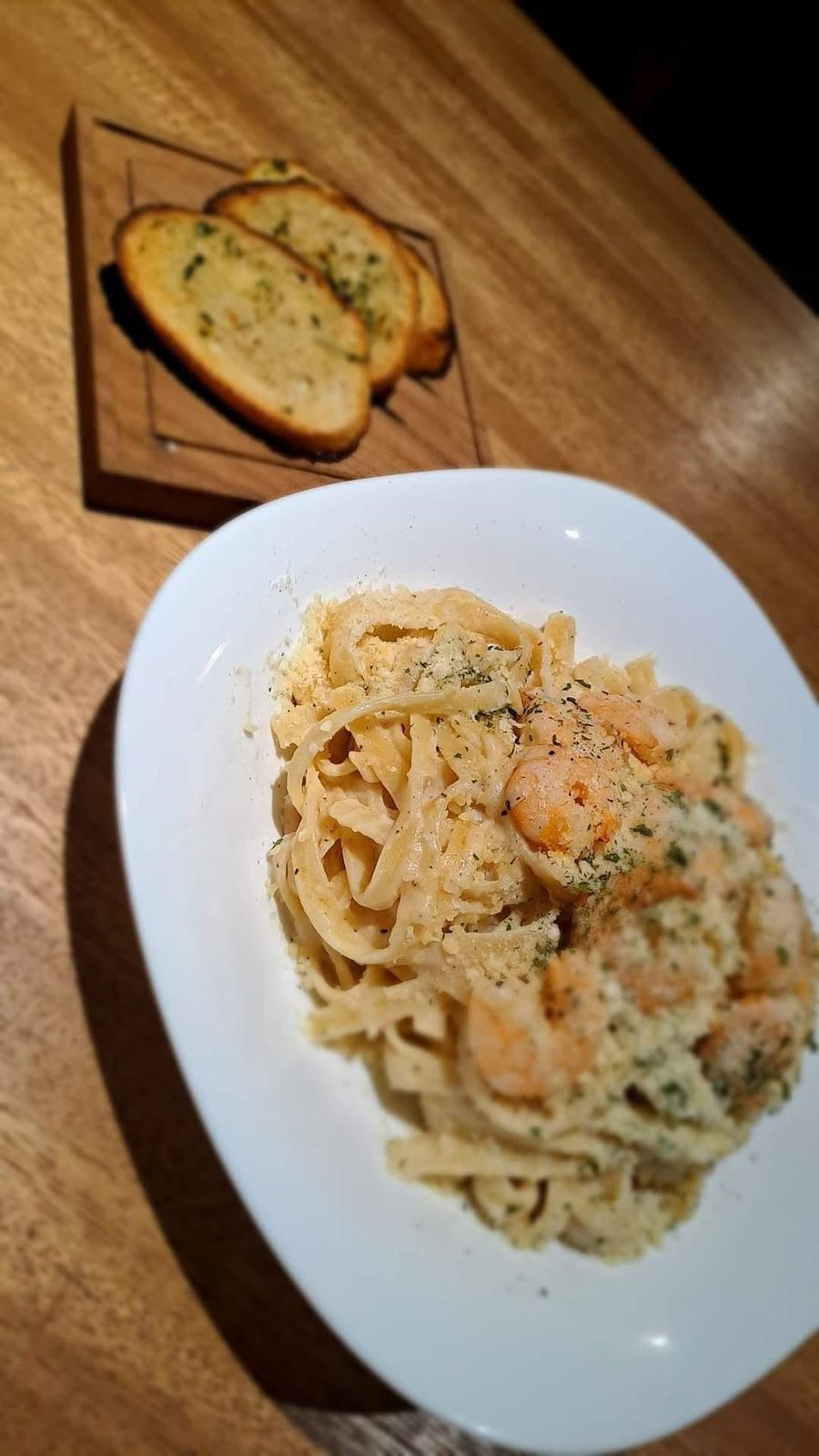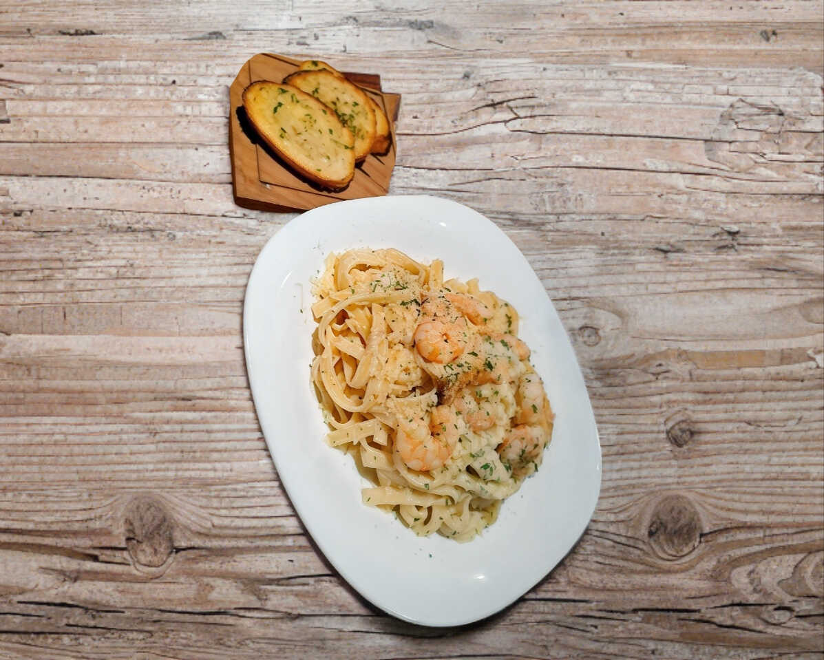 Salsa alfredo, champiñones, Camarones, Queso parmesano, pan con Ajo y toque de perejil