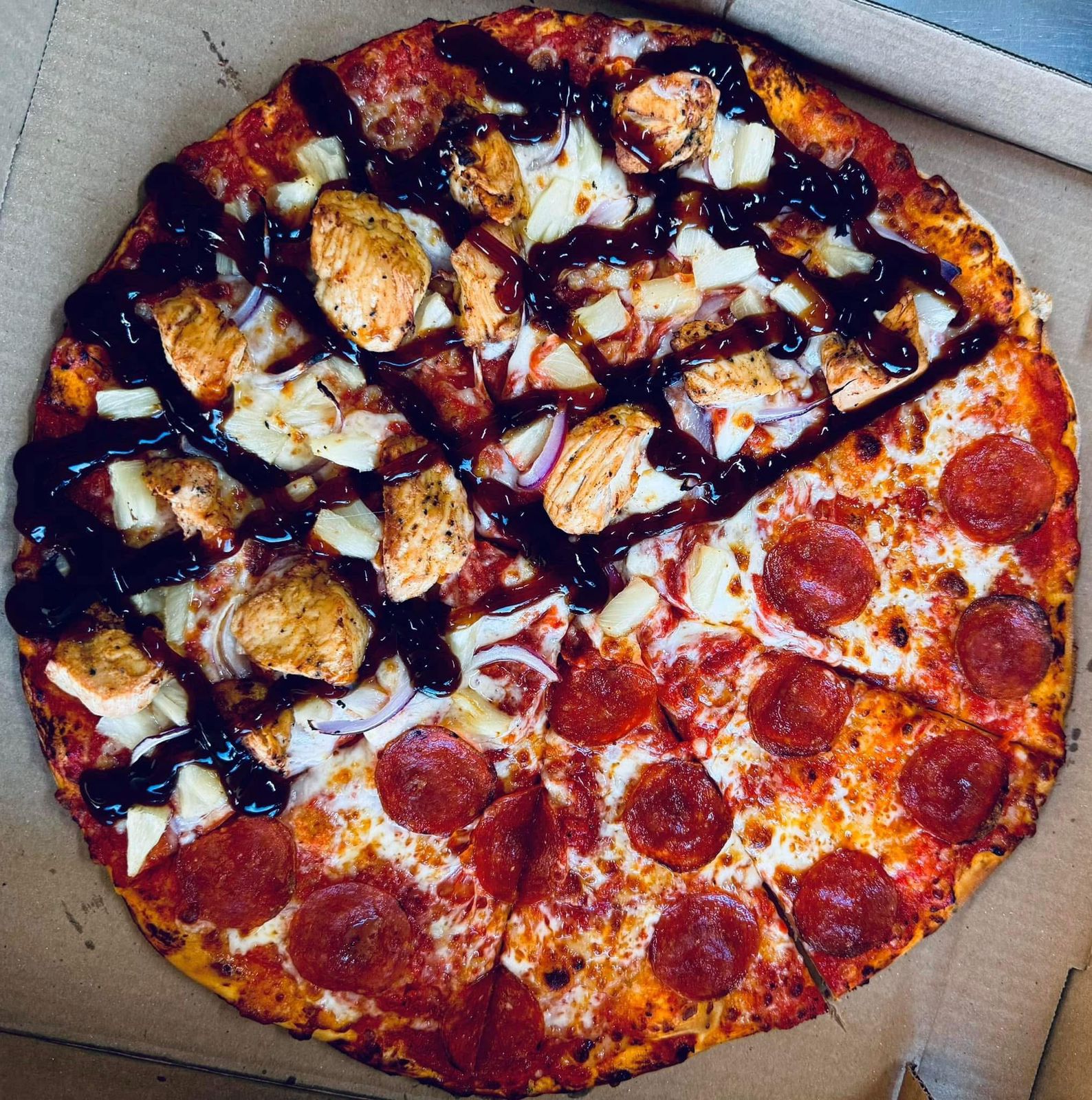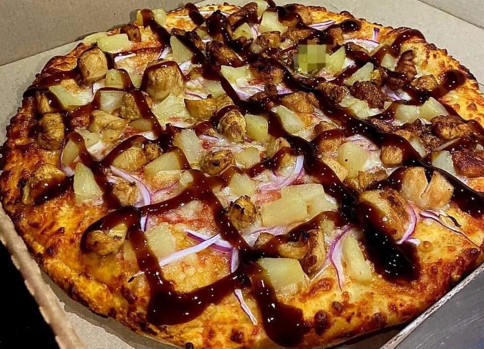 Pizza 6 rebanadas. Salsa de tomate, mozzarella, pollo a la parrilla, piña, cebolla morada y bbq.