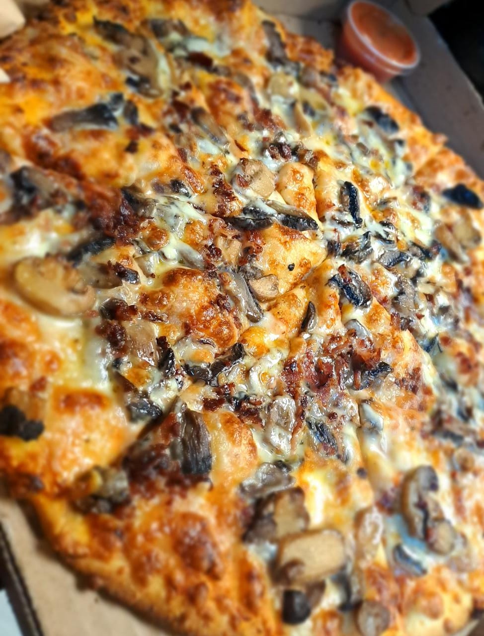 Pizza 8 rebanadas. Una Explosión De Sabores. Salsa de Tómate, Queso Mozzarella, Champiñones Salteados Y Crujiente Tocino