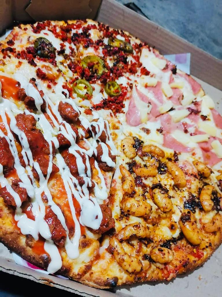 Pizza 8 rebanadas. Salsa de tomate, mozzarella, pollo a la parrilla, piña, cebolla morada y bbq.