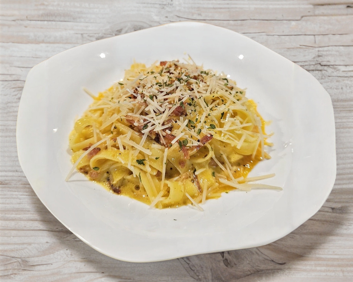 Tocino, huevo y queso parmesano. Acompañada de crotones.