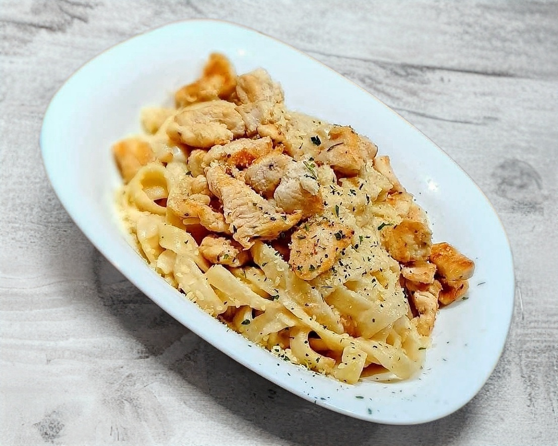 Salsa alfredo, champiñones, Pollo Parrillado, Queso parmesano, toque de perejil y Crotones con Ajo