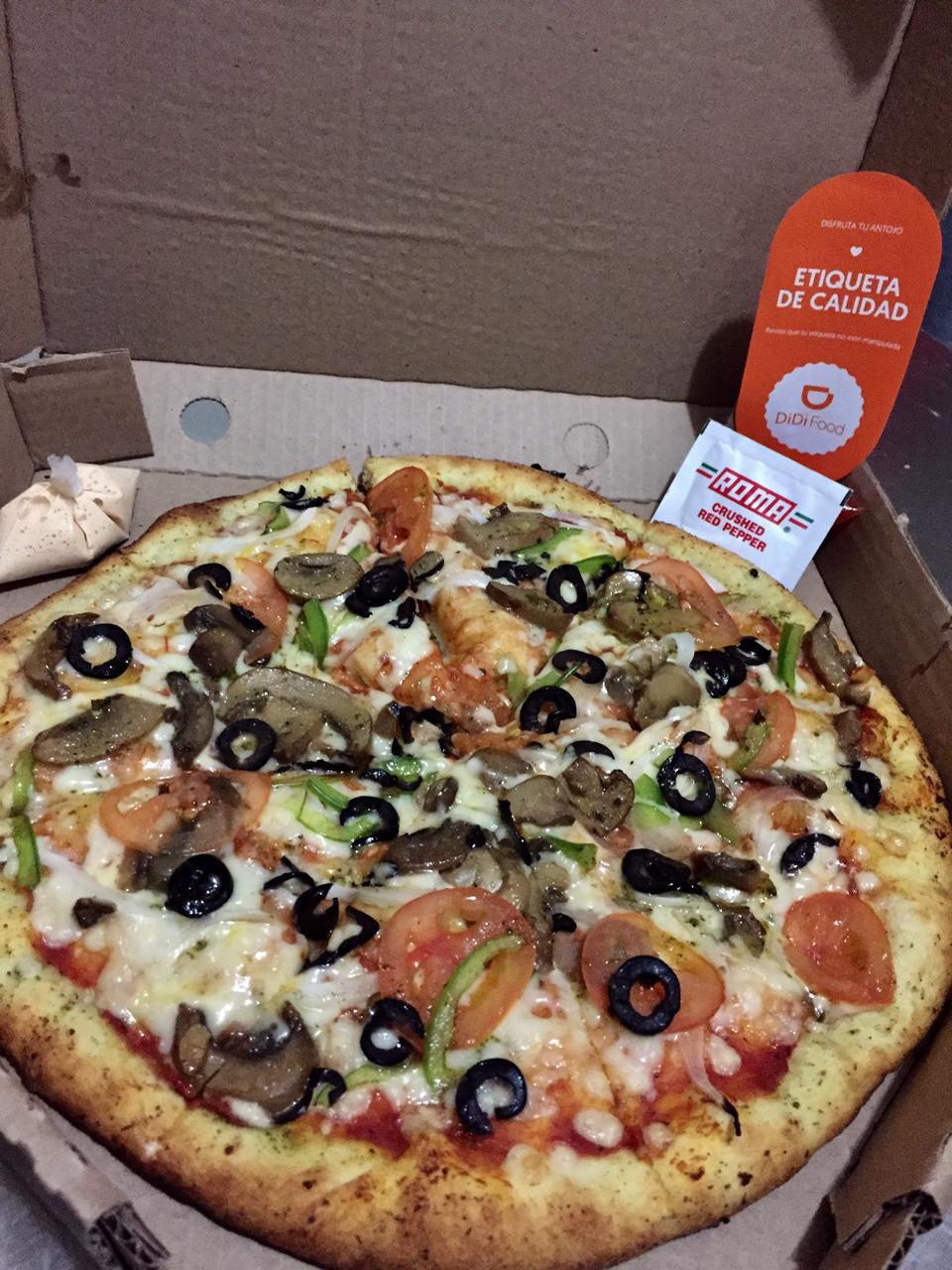 Pizza 8 rebanadas. Queso mozzarella, salsa de tomate, champiñones, aceituna, cebolla, morrón verde, rodajas de tomate y pesto.