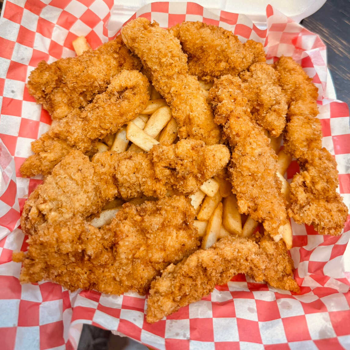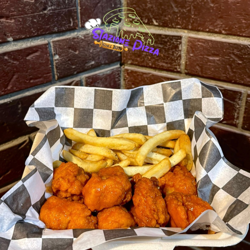 1\2 kilo de Trozos de pechuga de pollo empanizada bañados en tu salsa favorita. Acompañados de papas a la francesa y Aderezo Ranch.