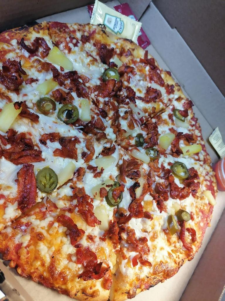 Pizza 6 rebanadas. Jugosa carne al pastor, piña, cebolla y jalapeños.
