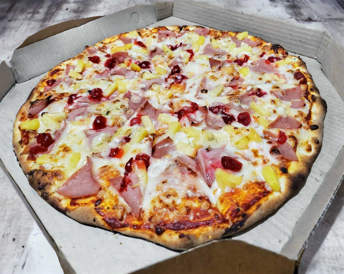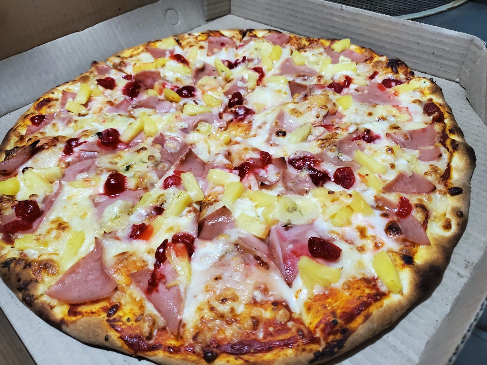 Pizza de 8 rebanadas. Salsa de Tomate, Queso Mozzarella, Piña, Cereza, Plátano y Extra Queso