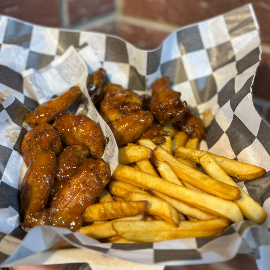8 Piezas de Alitas bañadas en tu salsa favorita. Acompañado de papas a la francesa y ranch