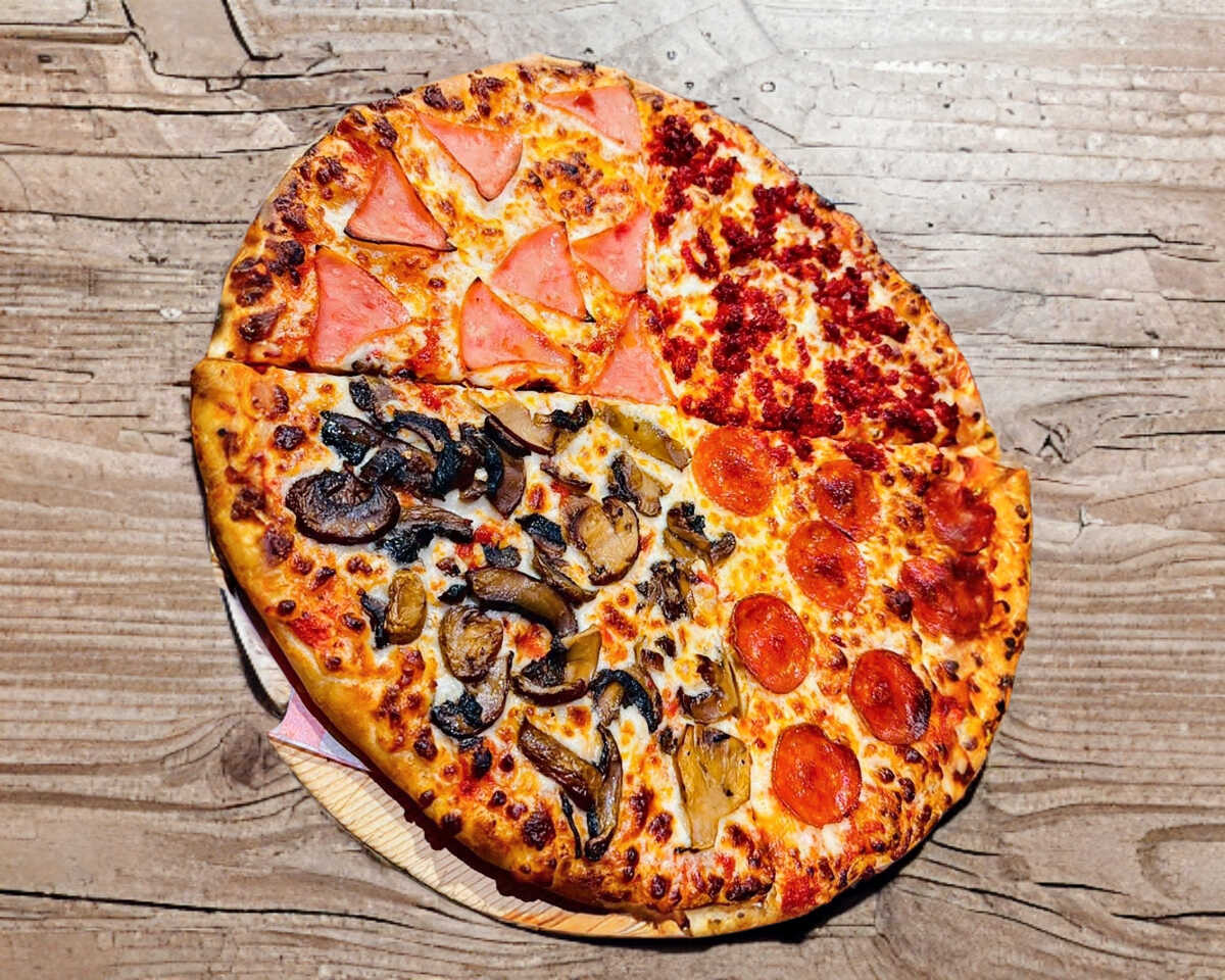 Pizza 6 rebanadas. Queso mozzarella, salsa de tomate, Pepperoni, Salami, Jamón, Salchicha y Tocino