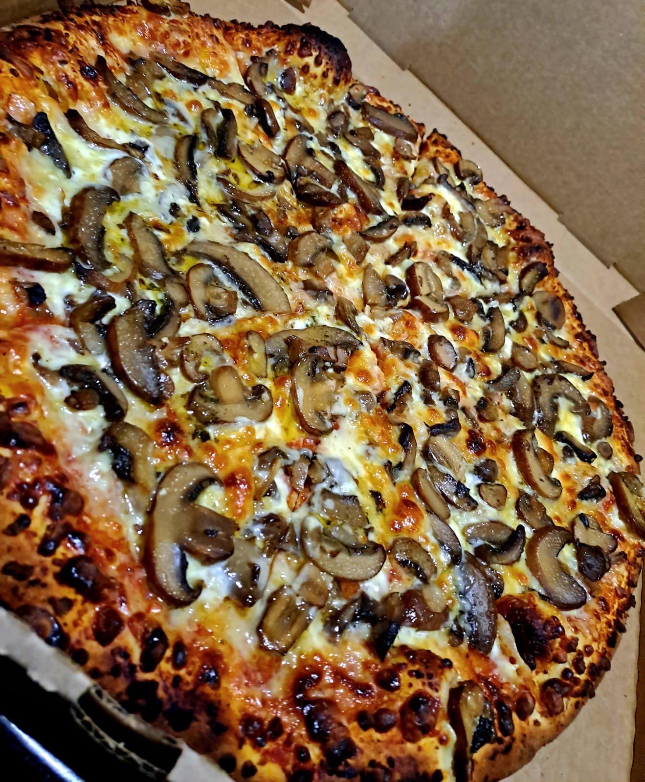Pizza de 8 rebanadas. Salsa de tomate, mozzarella y champiñones salteados.