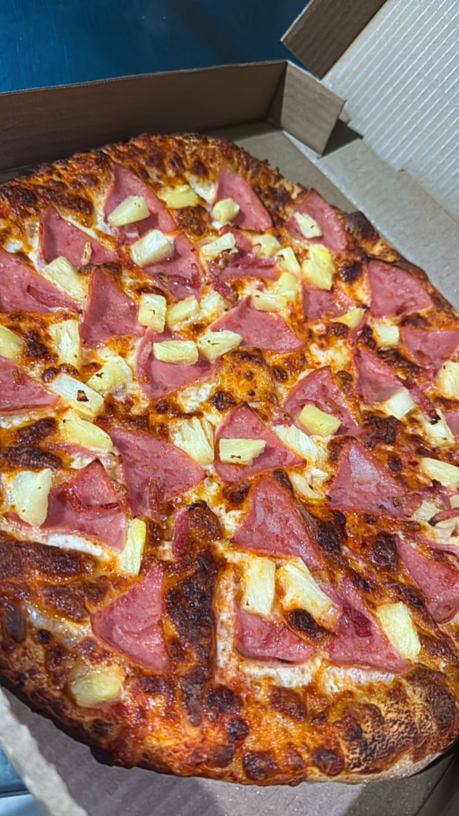 Pizza de 6 rebanadas. Queso mozzarella, salsa tomate, jamón de pavo, piña y tocino
