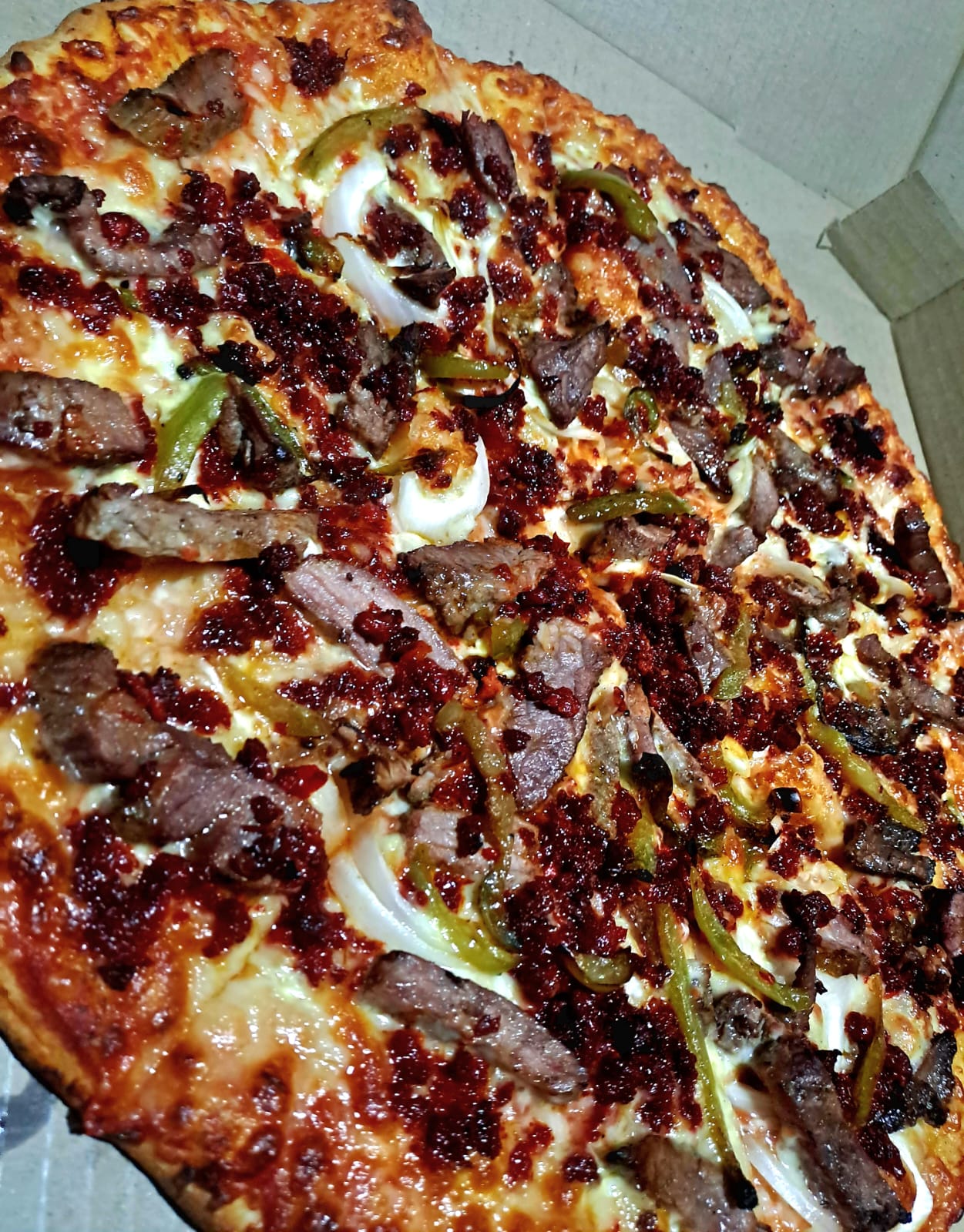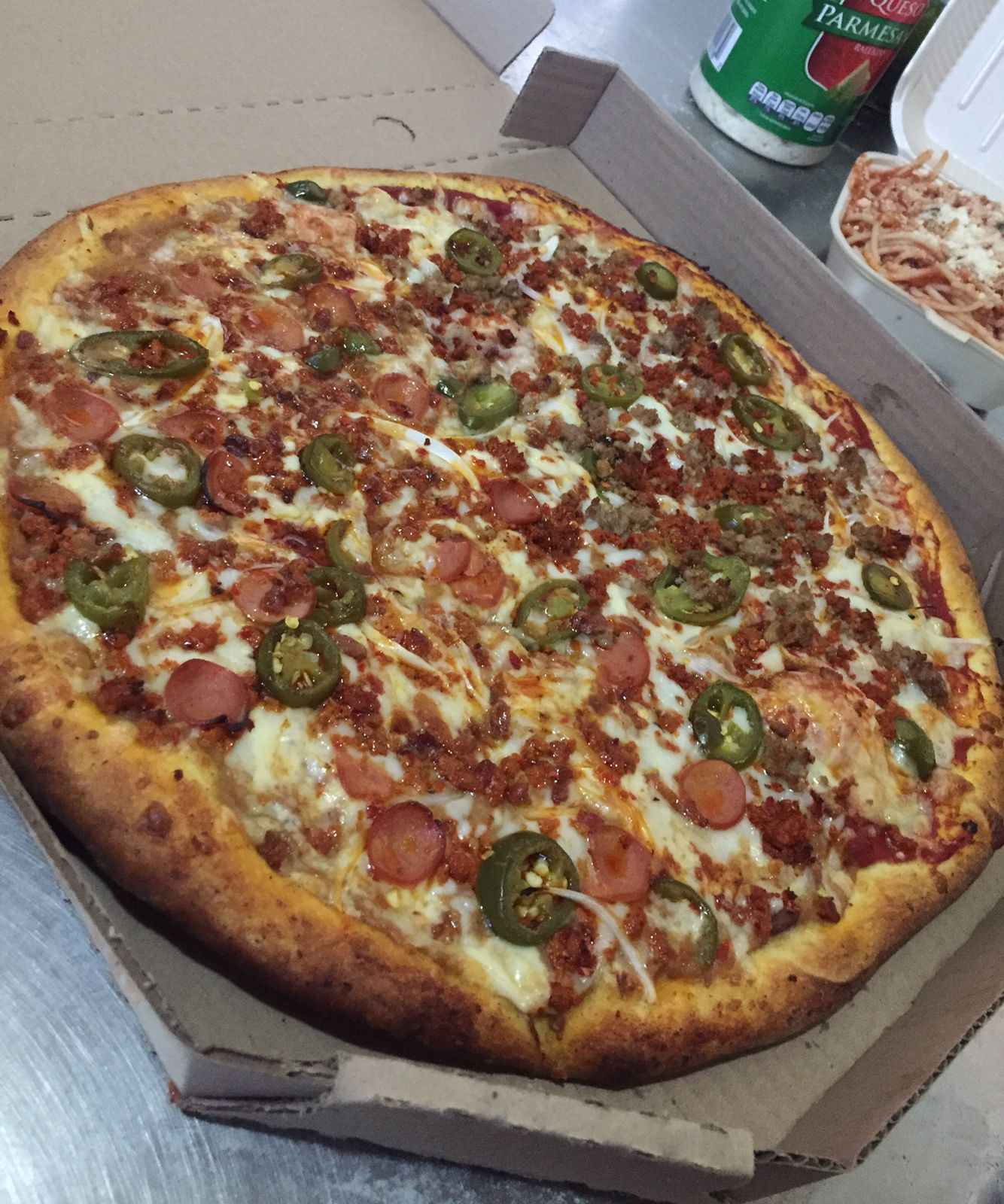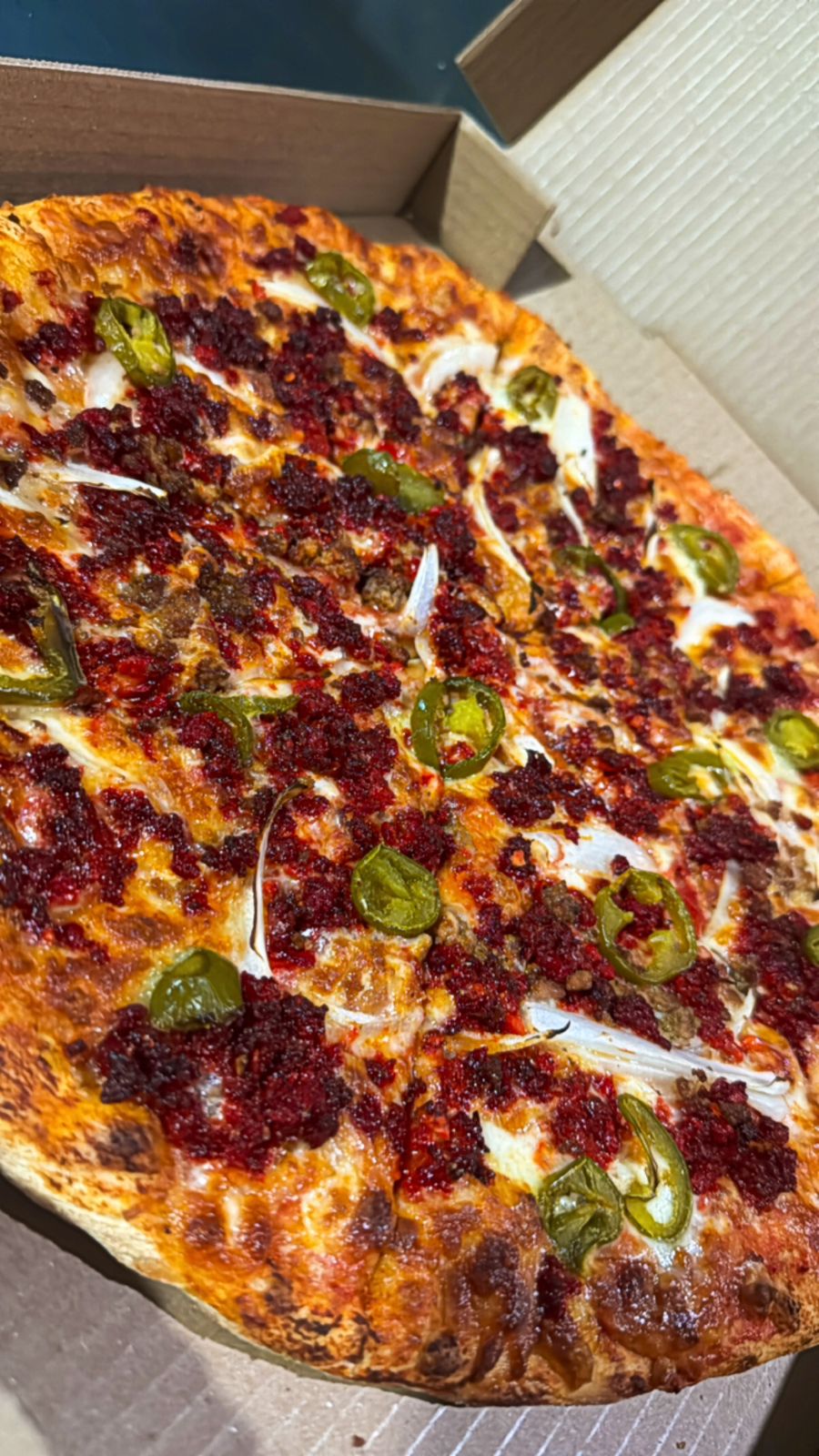 Pizza de 6 rebanadas. Queso mozzarella, salsa de tomate, chorizo, carne molida, jalapeño y cebolla.