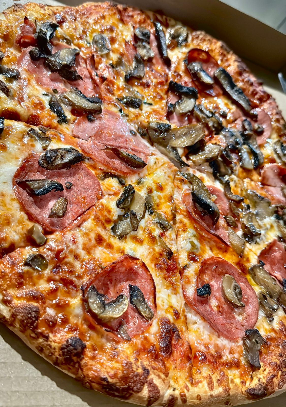 Salsa de tomate, mozzarella peperoni, jamon de pavo y champiñones.