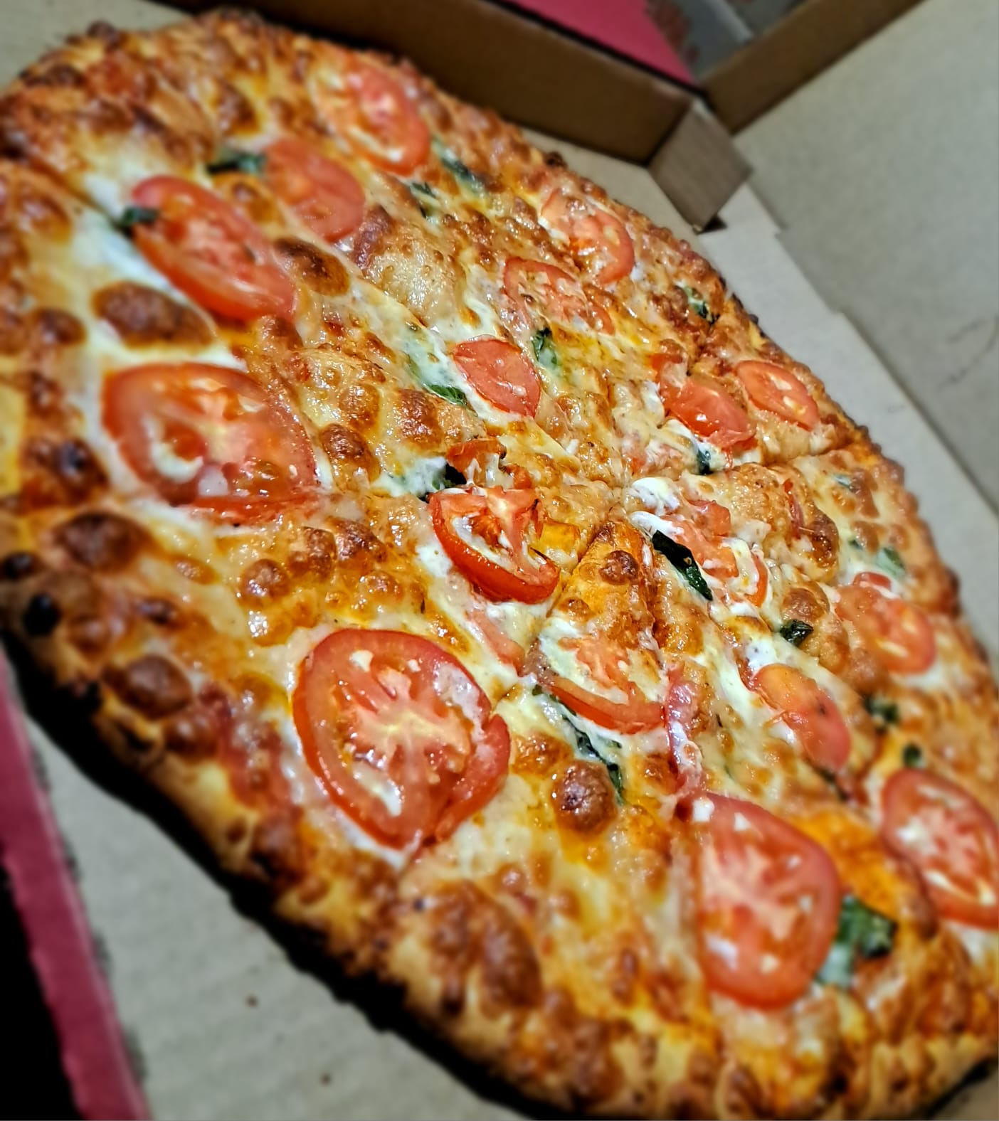 Pizza 8 rebanadas. Queso mozzarella, Salsa, Tomate, Toque de Albahaca y Queso Parmesano.