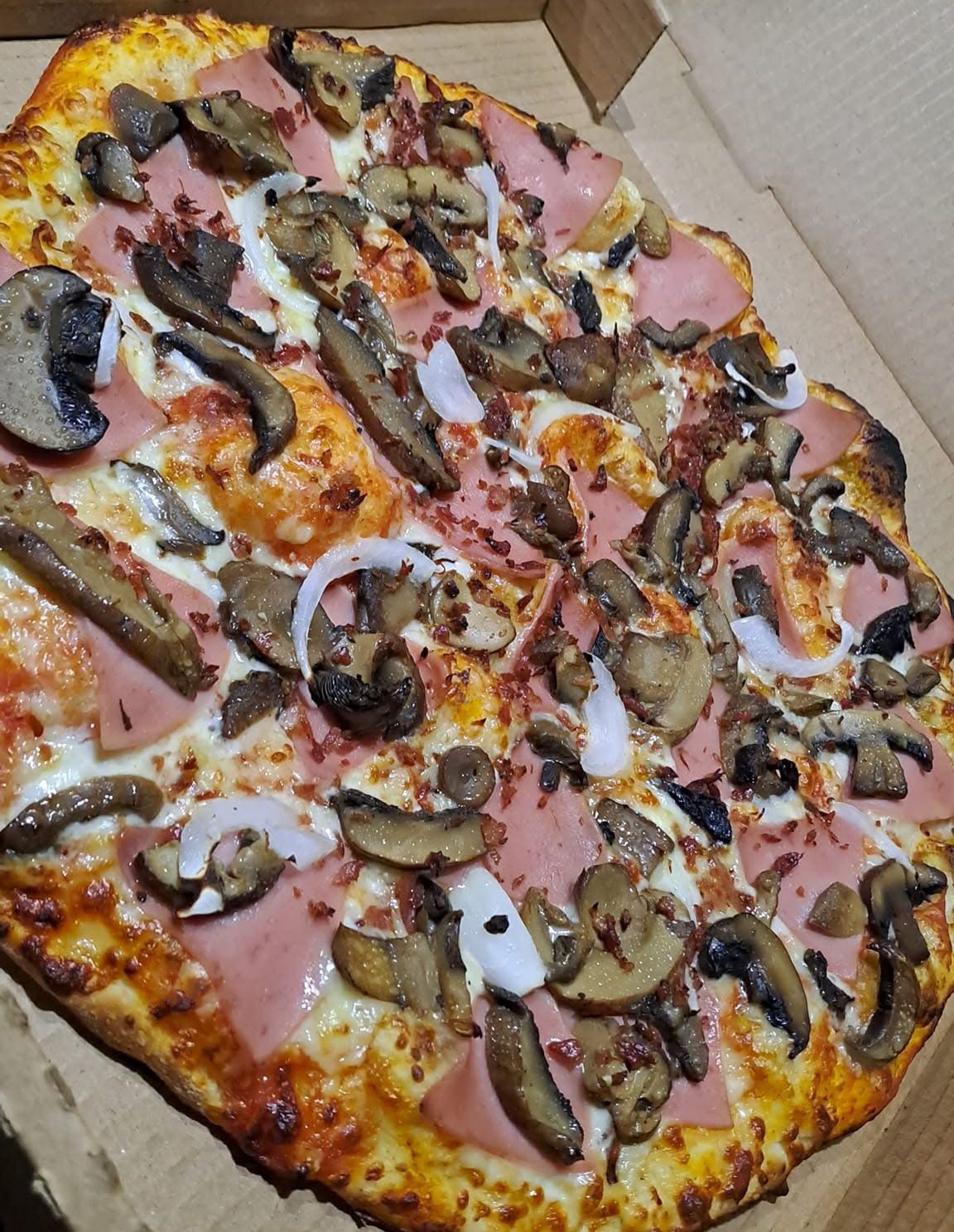 Pizza 6 rebanadas. Una Explosión De Sabores. Salsa de Tómate, Queso Mozzarella, Champiñones Salteados Y Crujiente Tocino