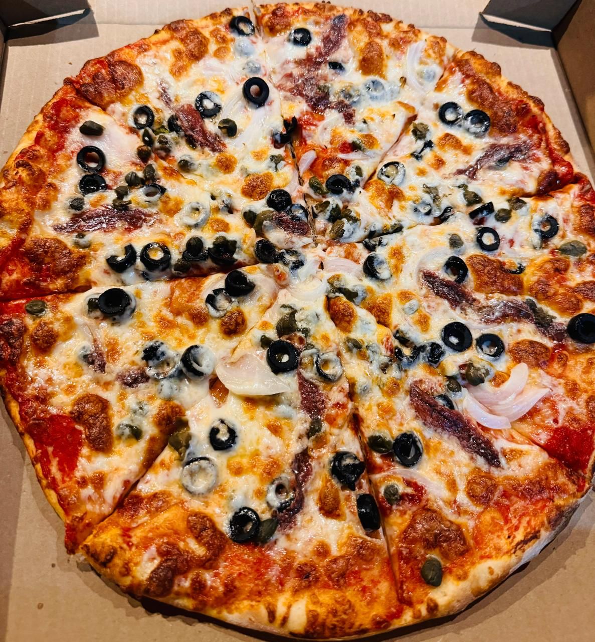 Pizza 6 rebanadas. Salsa de tomate, Mozzarella, Anchoas, Alcaparras, Cebolla, Aceitunas negras y Toque de Aceite de Olivo.