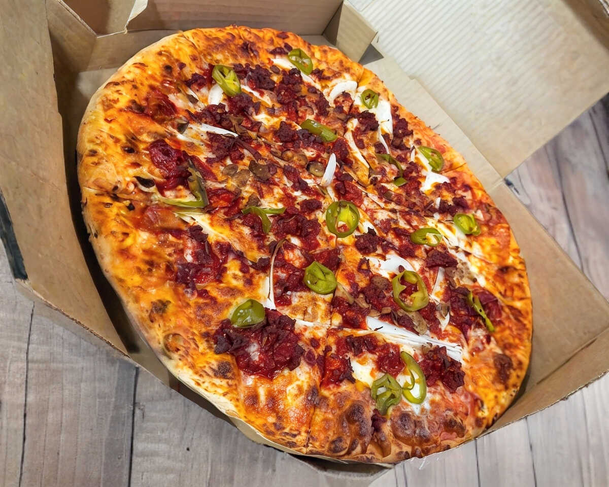 Pizza de 8 rebanadas. Queso mozzarella, salsa de tomate, chorizo, carne molida, jalapeño y cebolla.