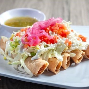 5 flautitas de pollo, acompañadas con ensalada verde, cebolla curtida y salsa verde.