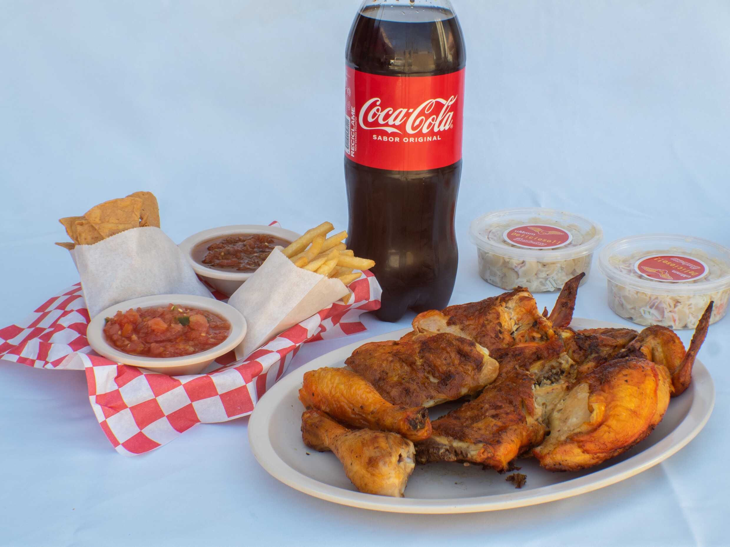 Pollo Entero 8 piezas, Salsa fresca, Tortillas, Papas fritas, totopos, Sopa fría y Refresco familiar de 1.5 litros.