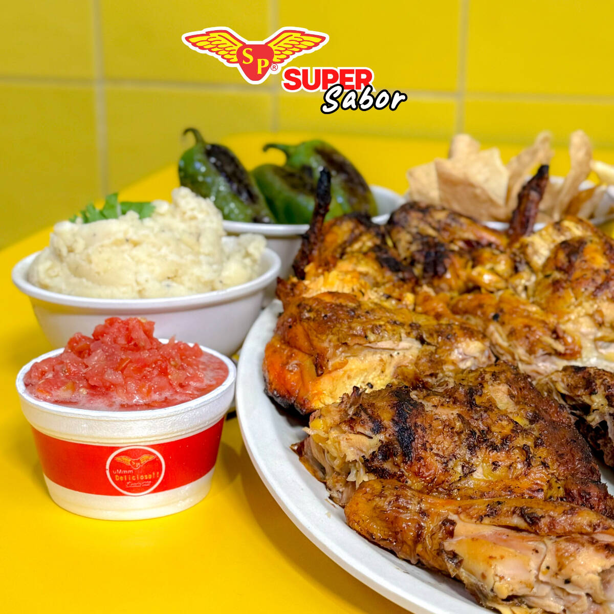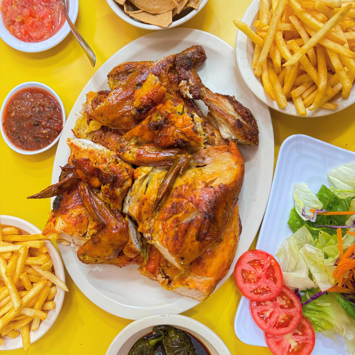 Pollo entero, acompañado de salsa, tortillas, papas fritas.
