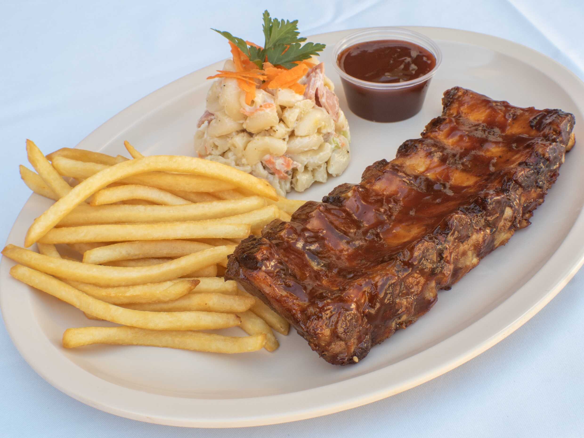 Costillas de Puerco al Carbon, Adobada o BBQ, servidas con Sopa, Papas Fritas, Salsa y Tortillas.