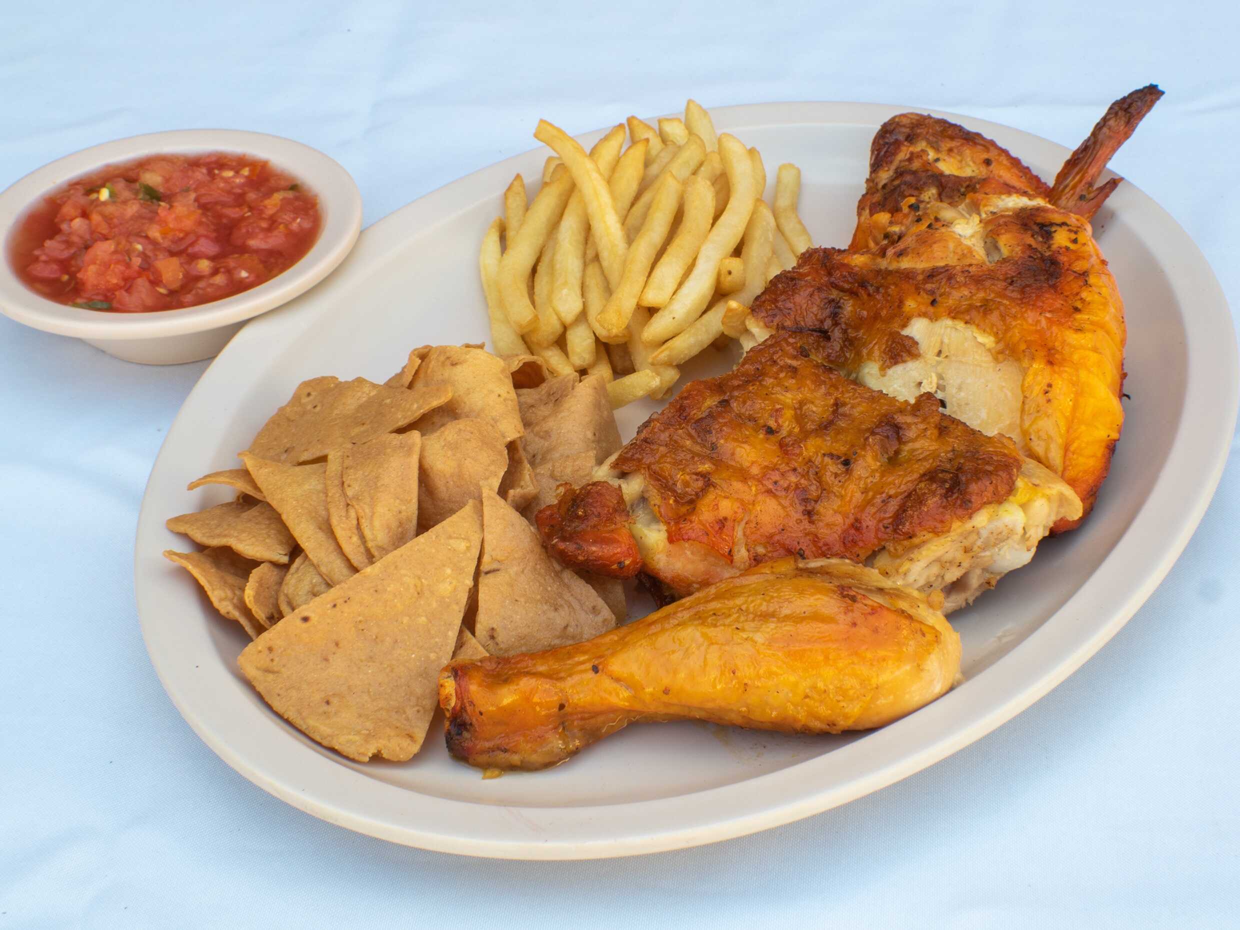 En la compra de 1 pollo entero, llevate gratis 1/2 pollo. incluye tortillas, salsa, papas fritas.