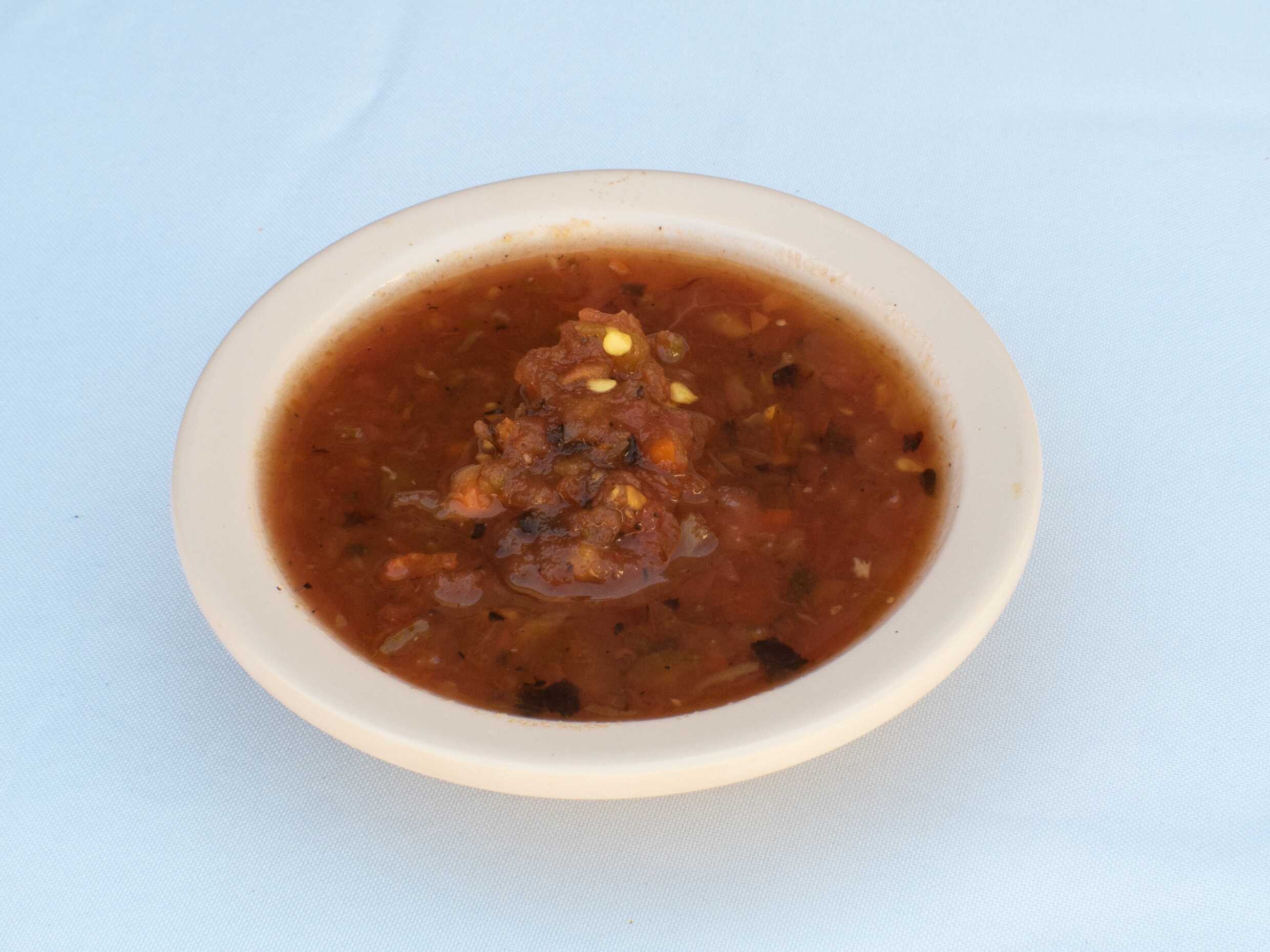 Al Carbón servida con papas fritas, sopa fría, tortillas y salsa.