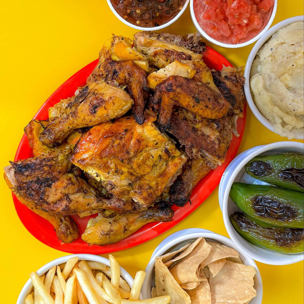 En la compra de 1 pollo entero, llevate gratis 1/2 pollo. incluye tortillas, salsa, papas fritas.