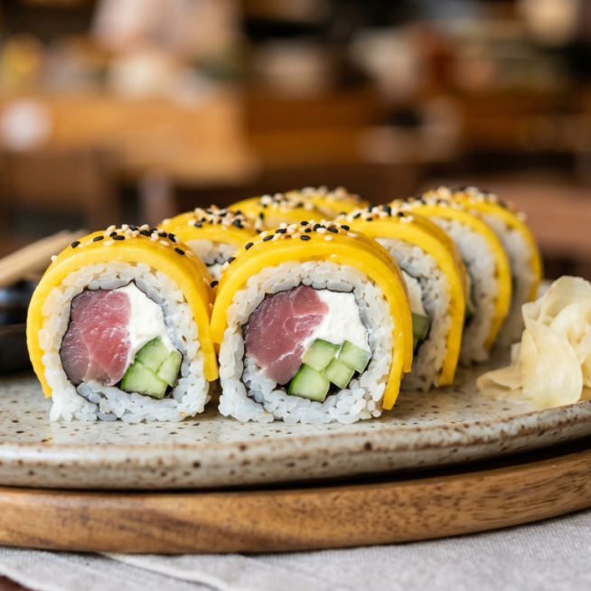 Por fuera: arroz y mango. por dentro: arroz, queso crema, pepino y atun fresco