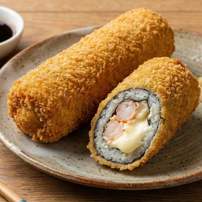 Por fuera: empanizado. por dentro: arroz, pepino, queso crema y camarón picante