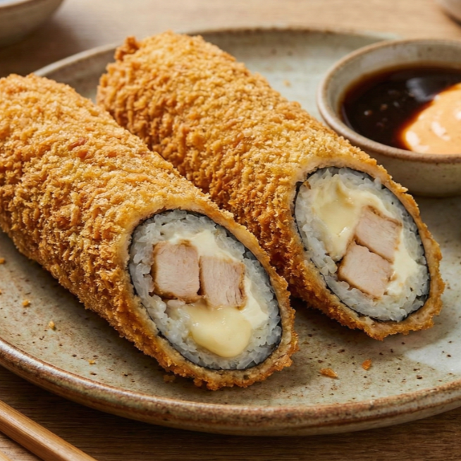 Por fuera: empanizado. por dentro: arroz, queso crema, pepino, camaron, carne y pollo