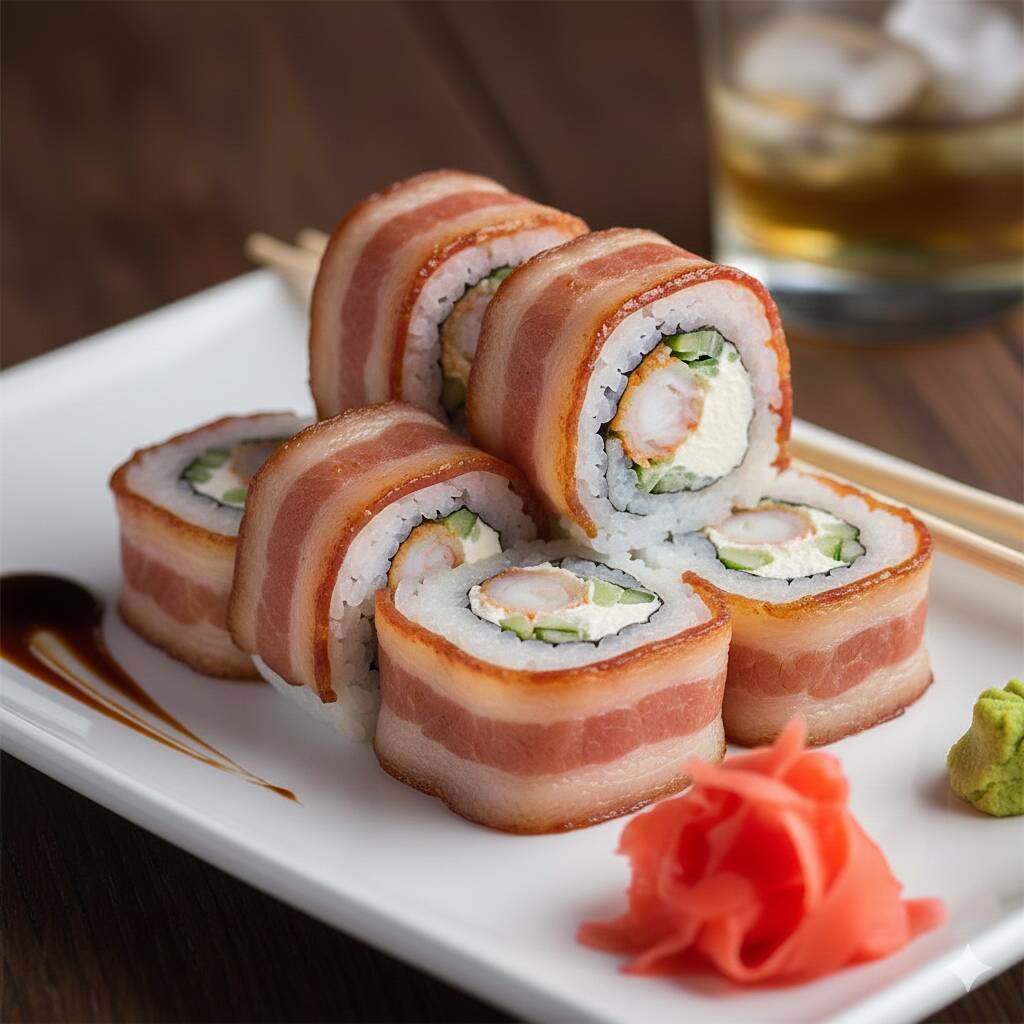 Por fuera: tocino. por dentro: arroz, queso crema, pepino y pollo.