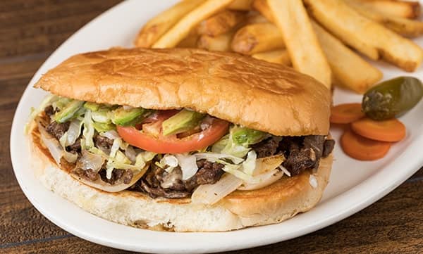 pan grande de torta , lechuga , tomate , cebolla , aguacate , carne al pastor ,
