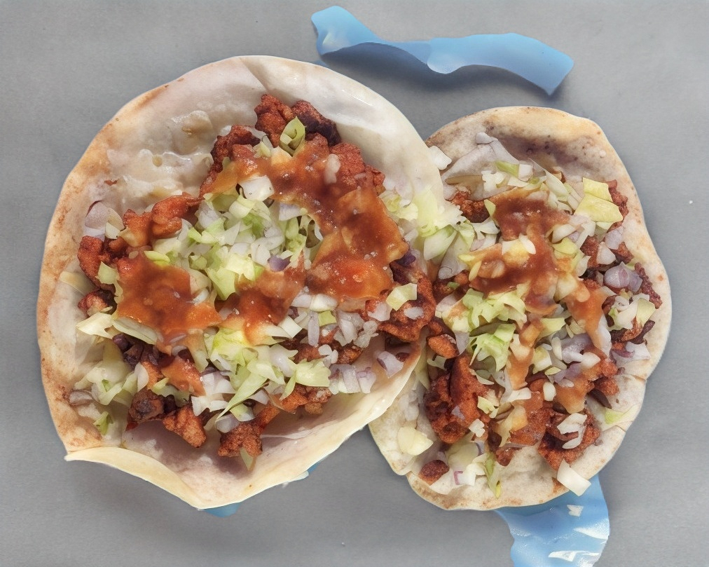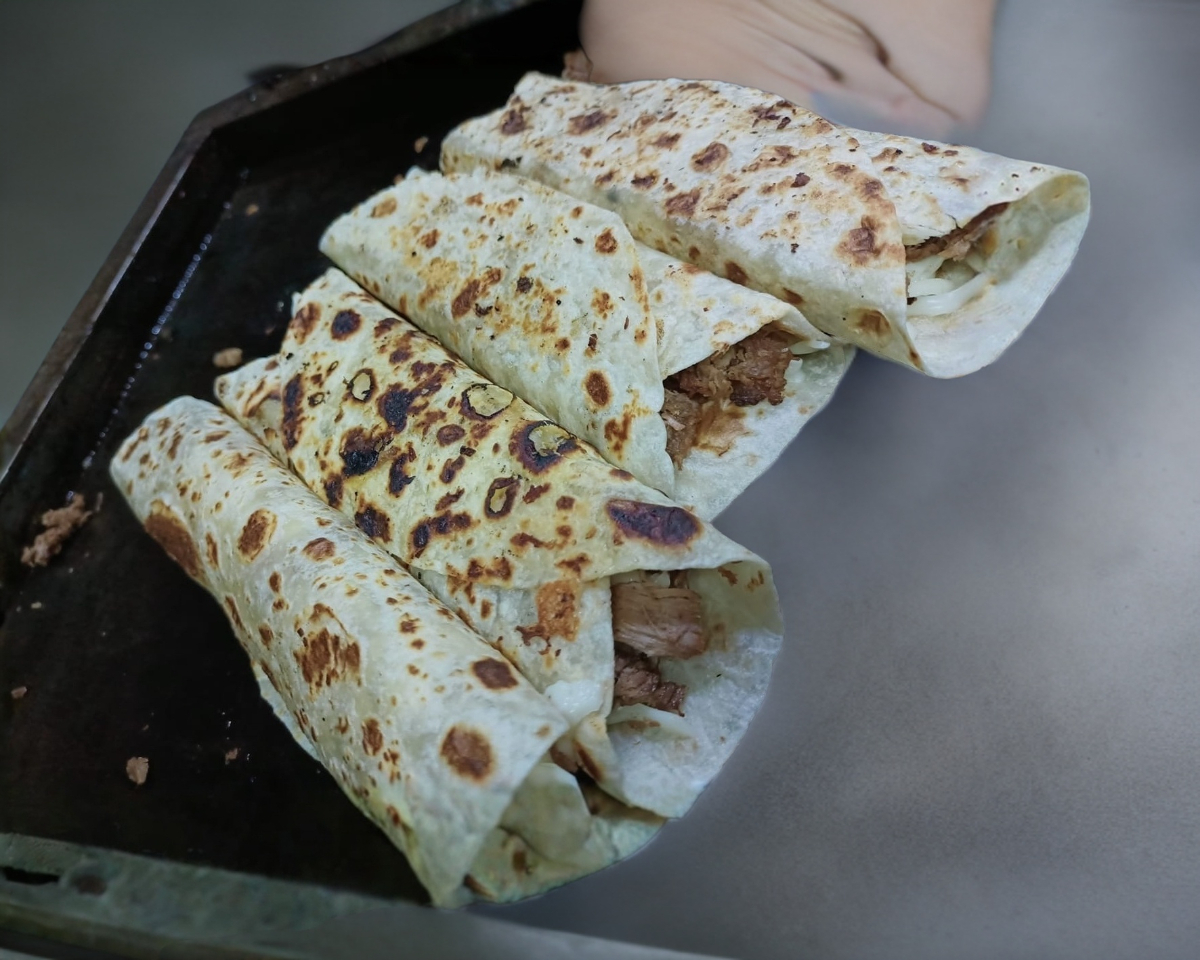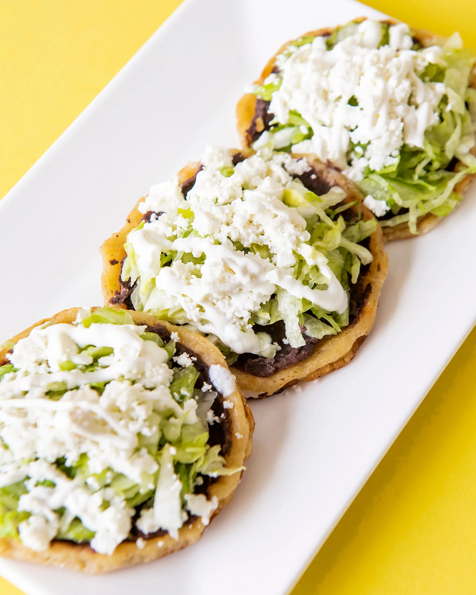 tortilla de maiz grande queso gratinado salsa mexicana tatemada , guacamole asiento de frijol