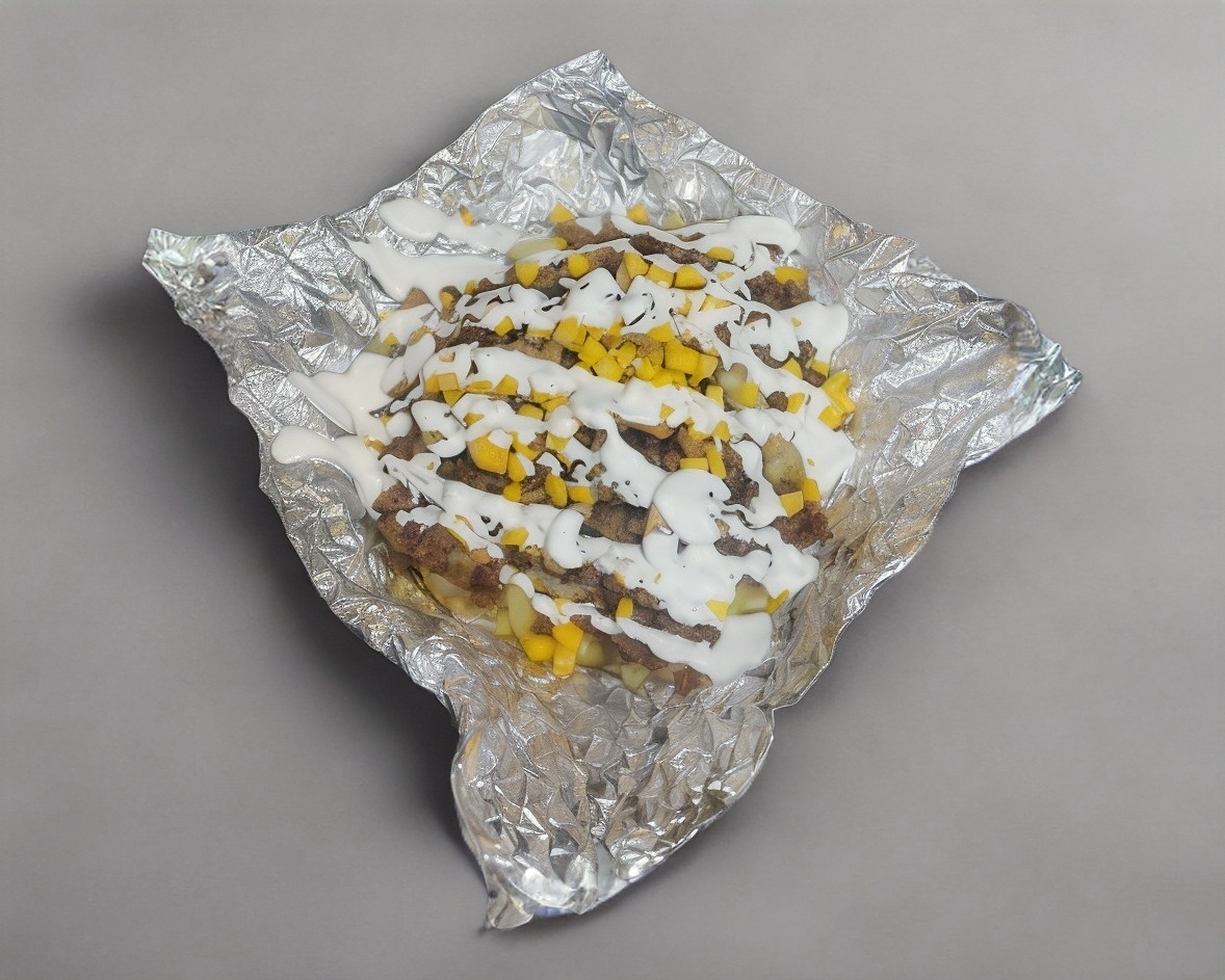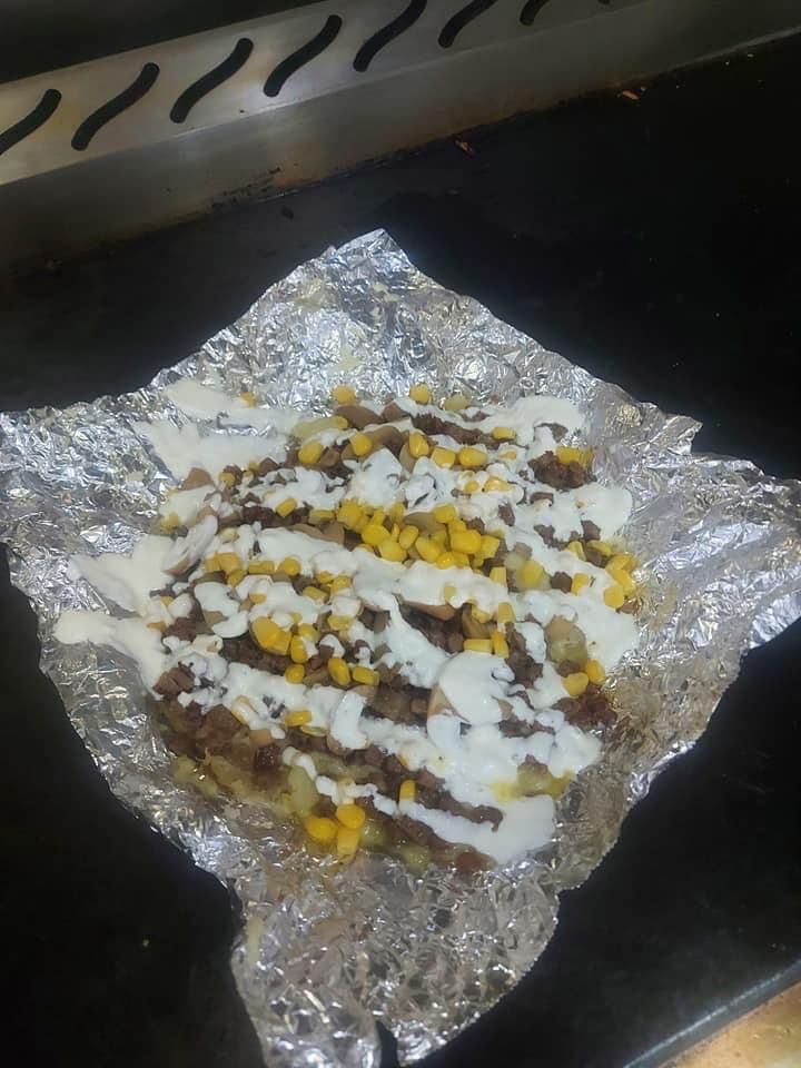 Papa Rellena preparado con queso, champiñones, elote, mantequilla y tripa.