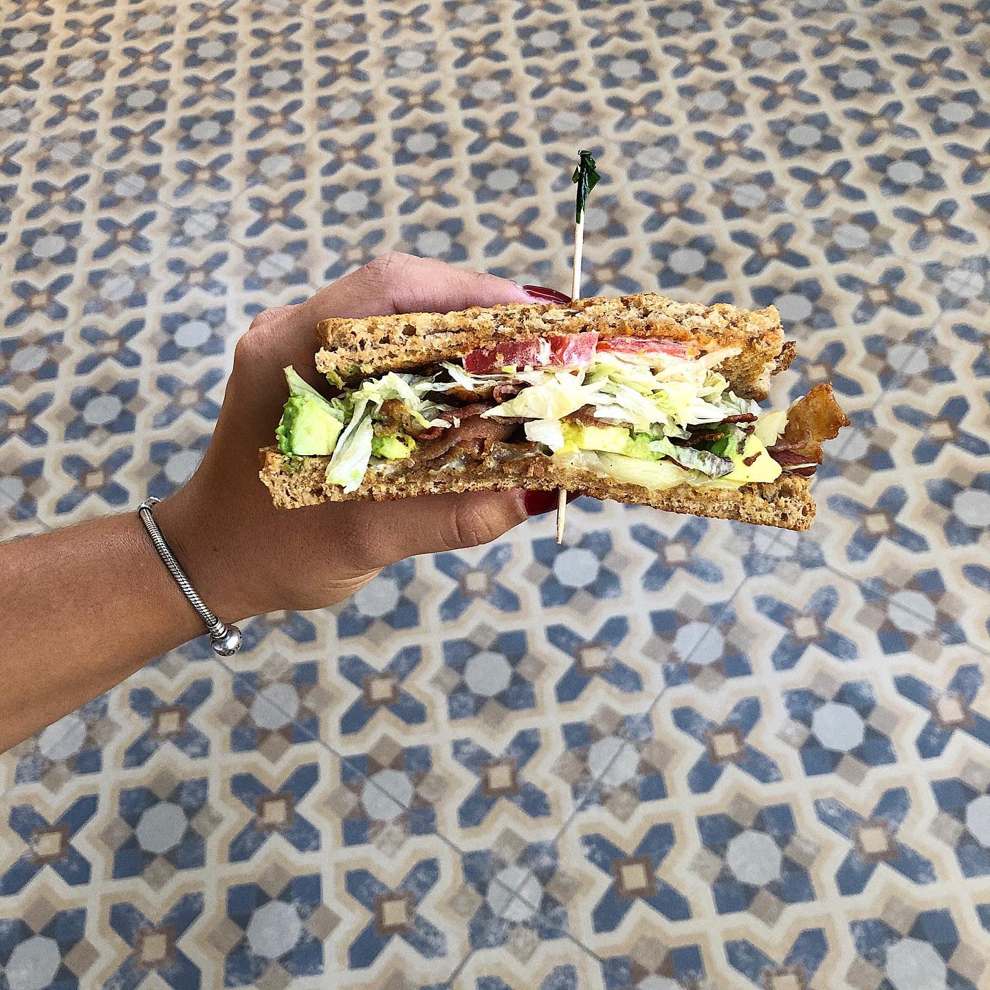 Bagguette con aguacate, tocino, espinaca y manzana verde.