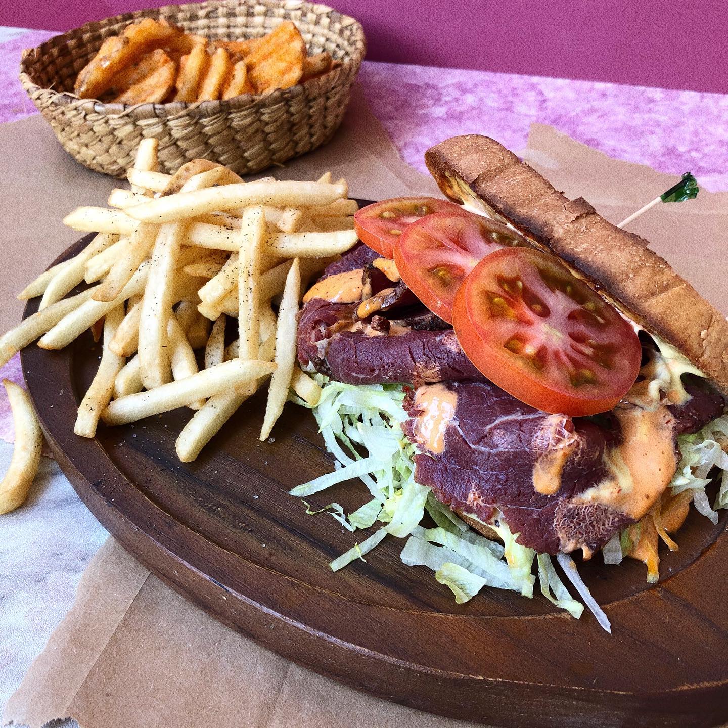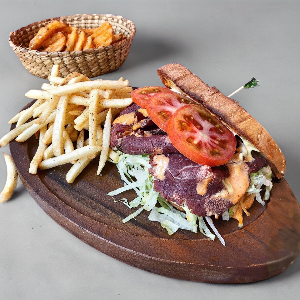 Baguette con bistec encebollado, aguacate, frijoles y aderezo chipotle.