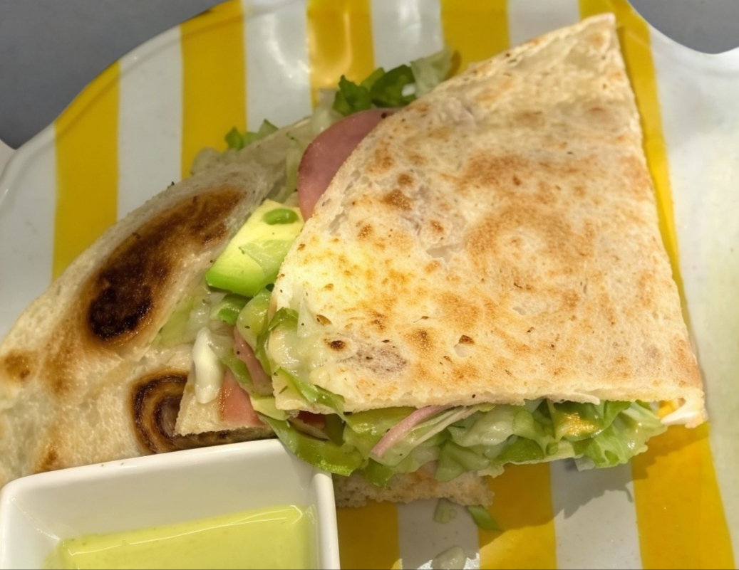 Tortilla de harina grande, queso mozarella, jamón , lechuga, tomate, aguacate y salsa aparte.