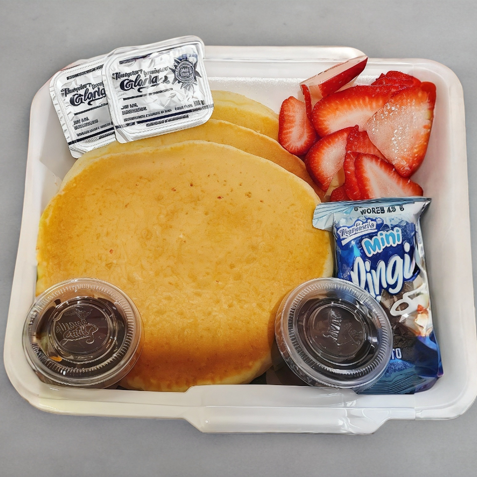Deliciosos hotcakes con fruta fresca (3pz de hotcakes ). Incluye : cubiertos, aderezo a elegir , mantequilla y café