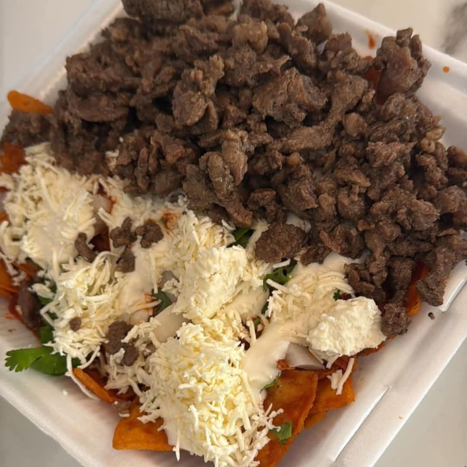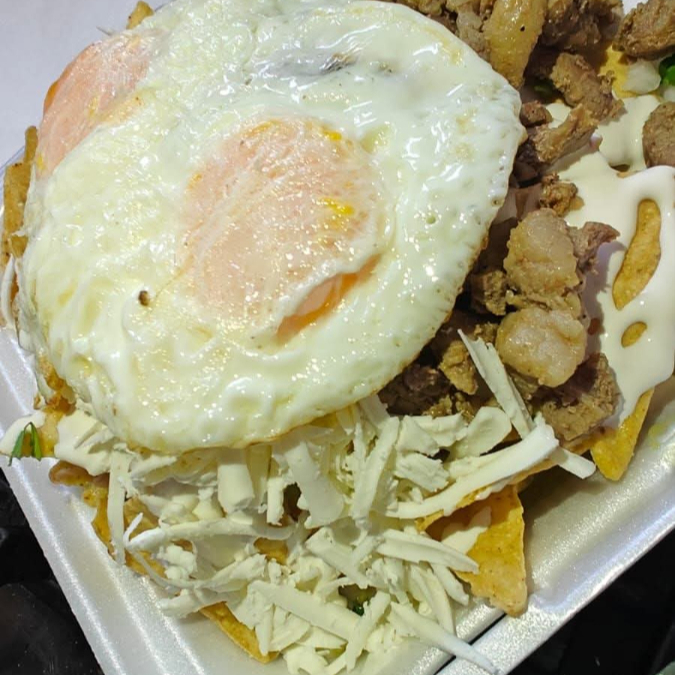 Totopos, salsa de la casa a elección del cliente, cilantro, cebolla morada, crema , queso , 2 huevos termino medio y carne asada .