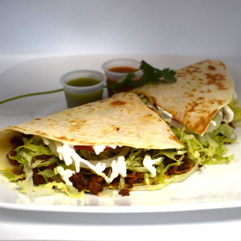 Tortilla de harina grande , queso mozarella, deshebrada, lechuga, tomate, aguacate y salsa aparte