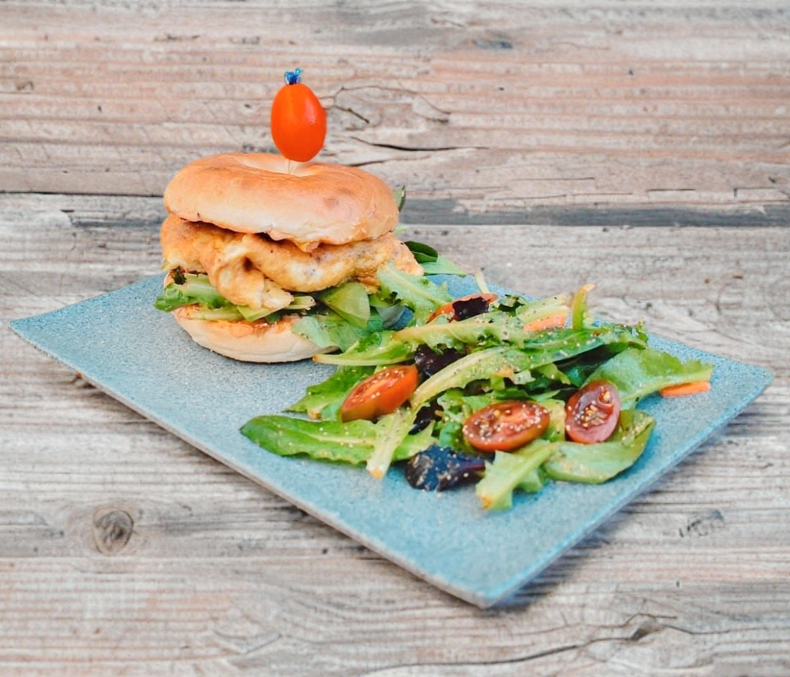 Elaborado con pan artesanal de la casa, pollo al chimichurri, dip de dijonesa de la casa, mozzarella, lechuga, tomate, germinado y cebolla.