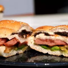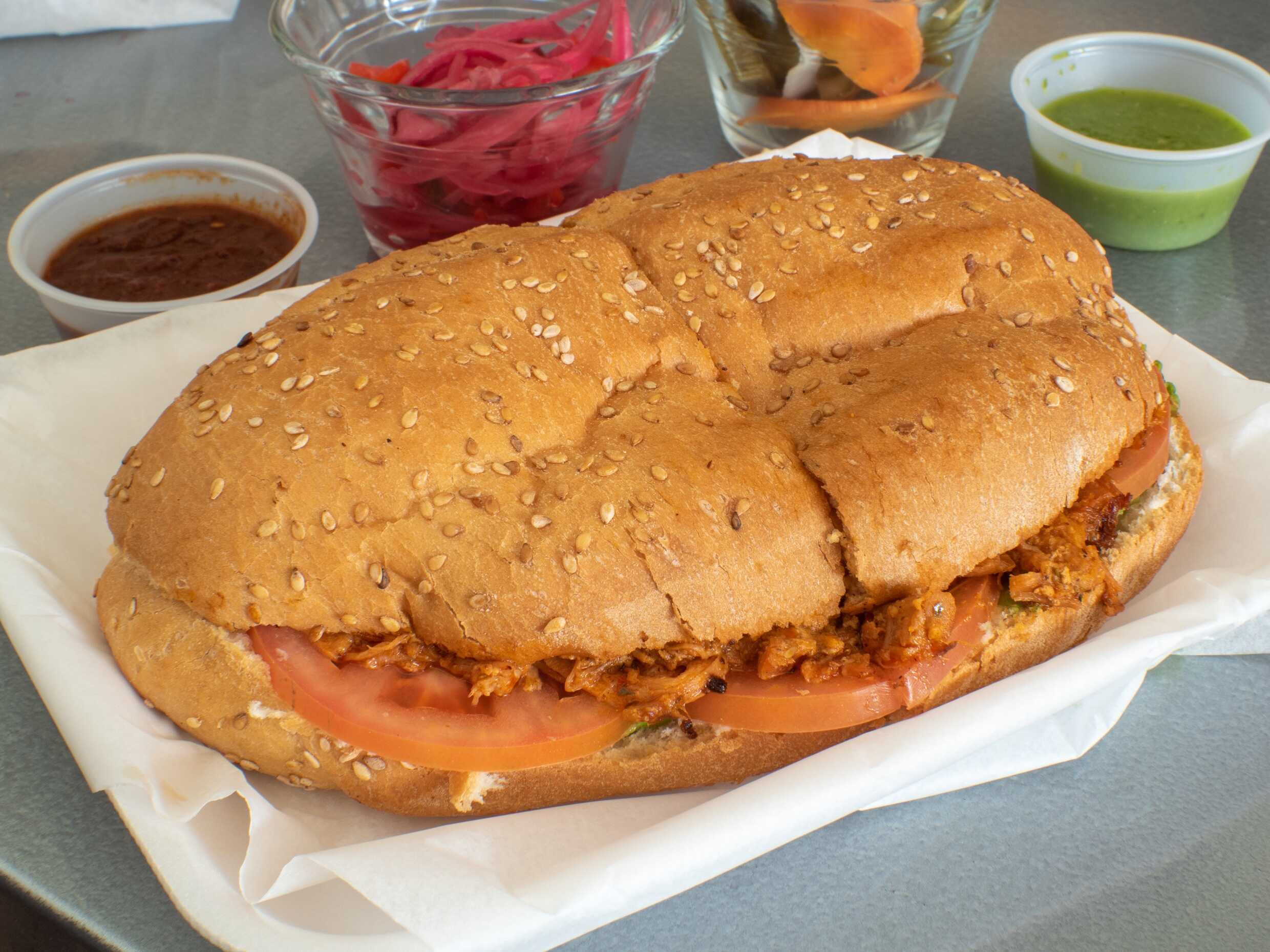 Deliciosa torta con milanesa de res, pierna, salchicha, jamón y queso oaxaca.
