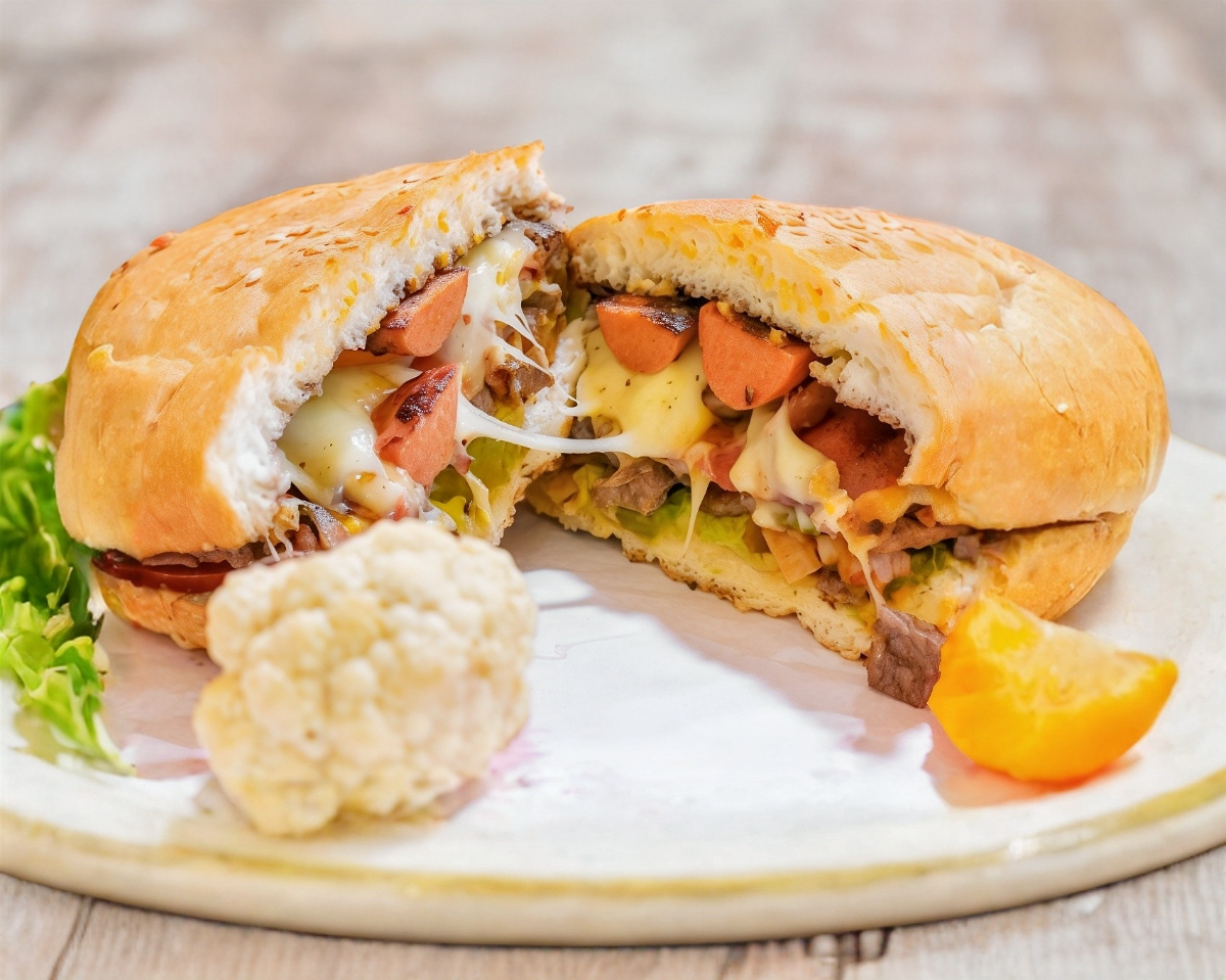 Carne asada, salchicha, queso Oaxaca, jamón, tocino y queso amarillo.