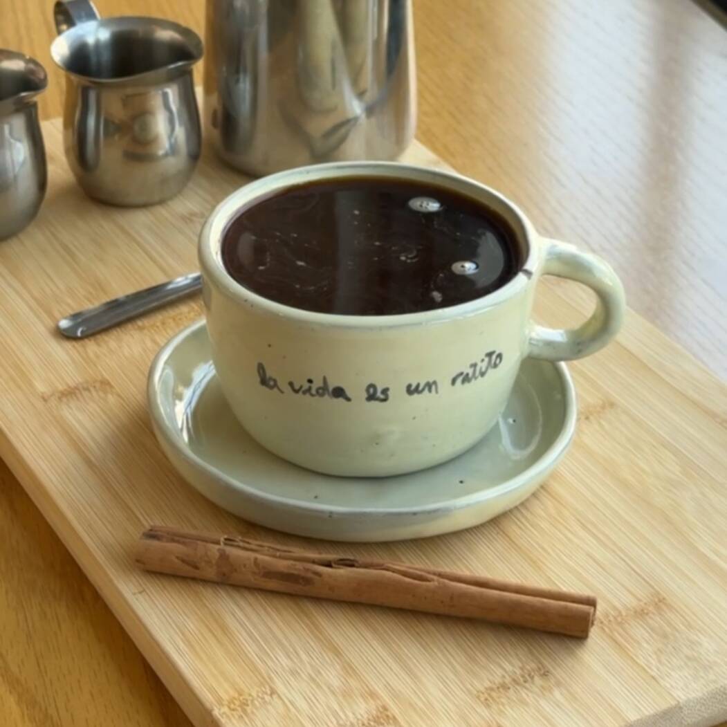 Doble shot de espreso, chocolate hecho en casa (cacao de Chiapas, canela, cardamomo y azucar) y leche texturizada en vaso de 12oz