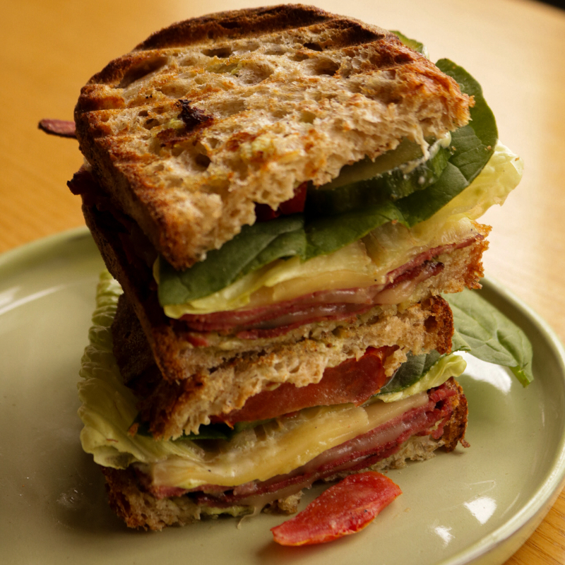 Pan de masa madre, mantequilla, roast beef, queso gouda, espinaca, tomate deshidratado, pepino, aderezo de mostaza dijon.