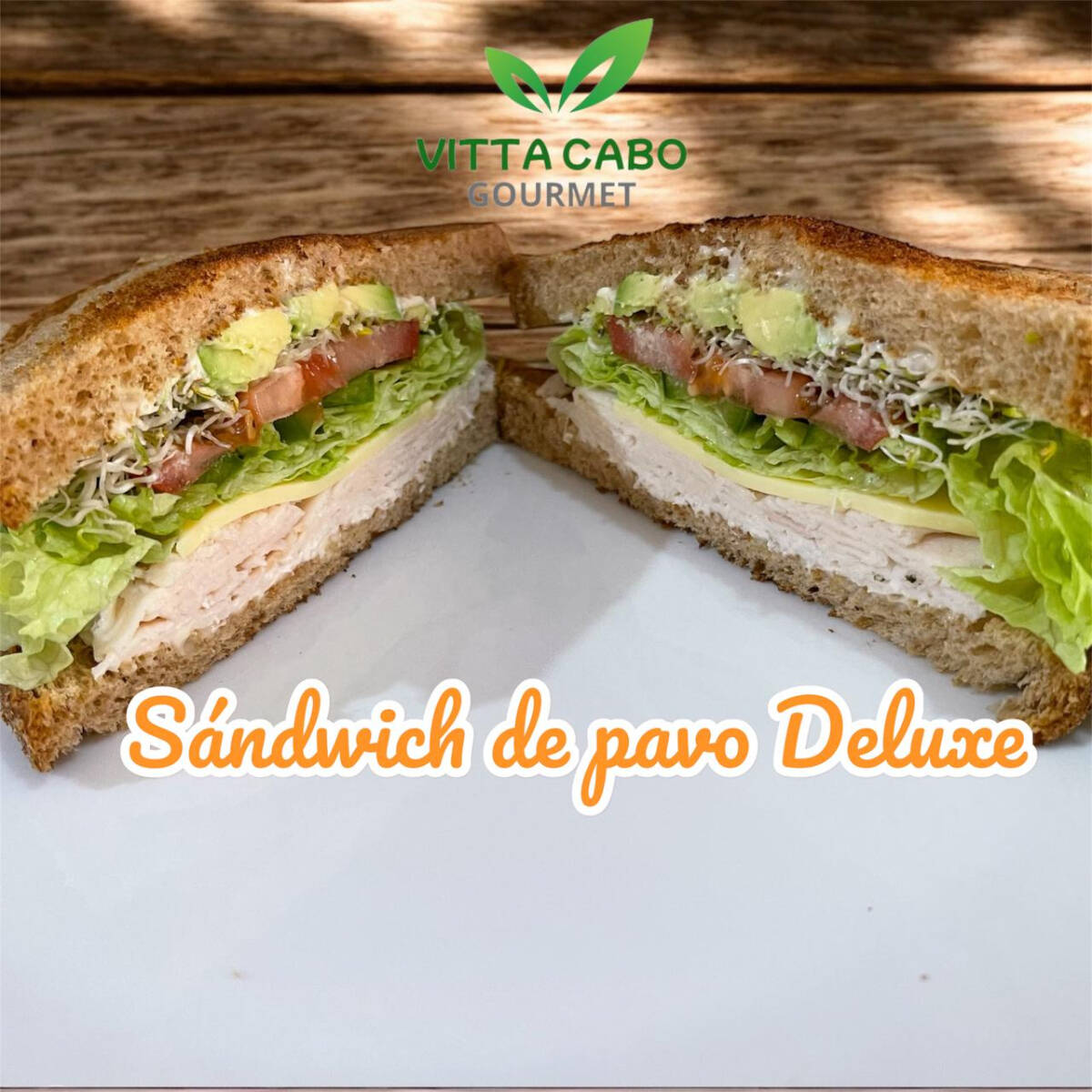 Sándwich opción ligera preparado con pan integral, finas rebanadas de pechuga de pavo, queso mozzarella, lleva fresco mix de hojas verdes, rodajas de tomate, laminas de aguacate y un aderezo suave de mostaza con mayonesa light y un toque de miel que realza el sabor.