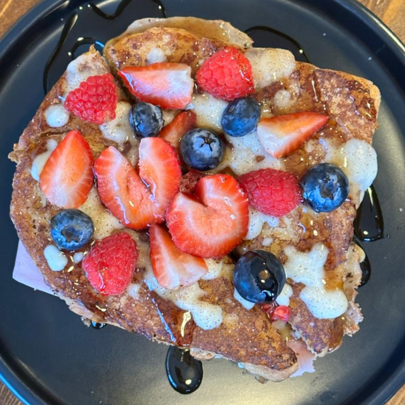 Pan francés relleno de salsa bechamel, jamón de pavo, mezcla de quesos, coronado con frutos rojos y miel de maple