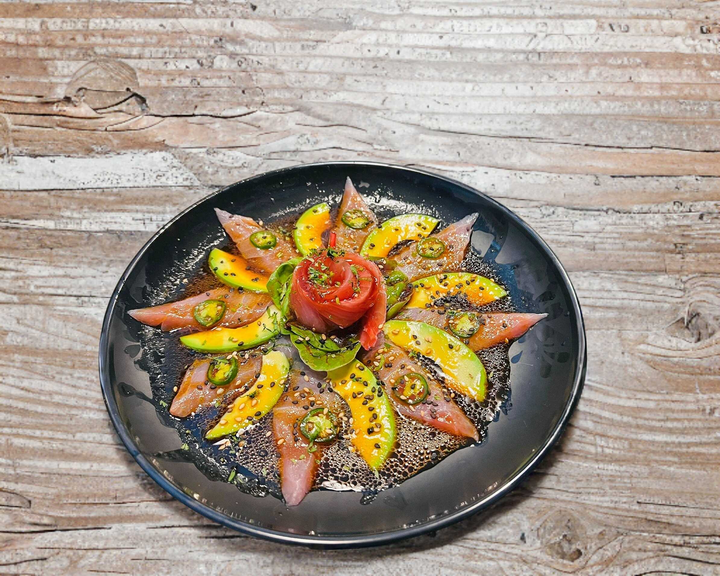 Laminas de pescado con pepino, aguacate, chile serrano y salsa serranito.