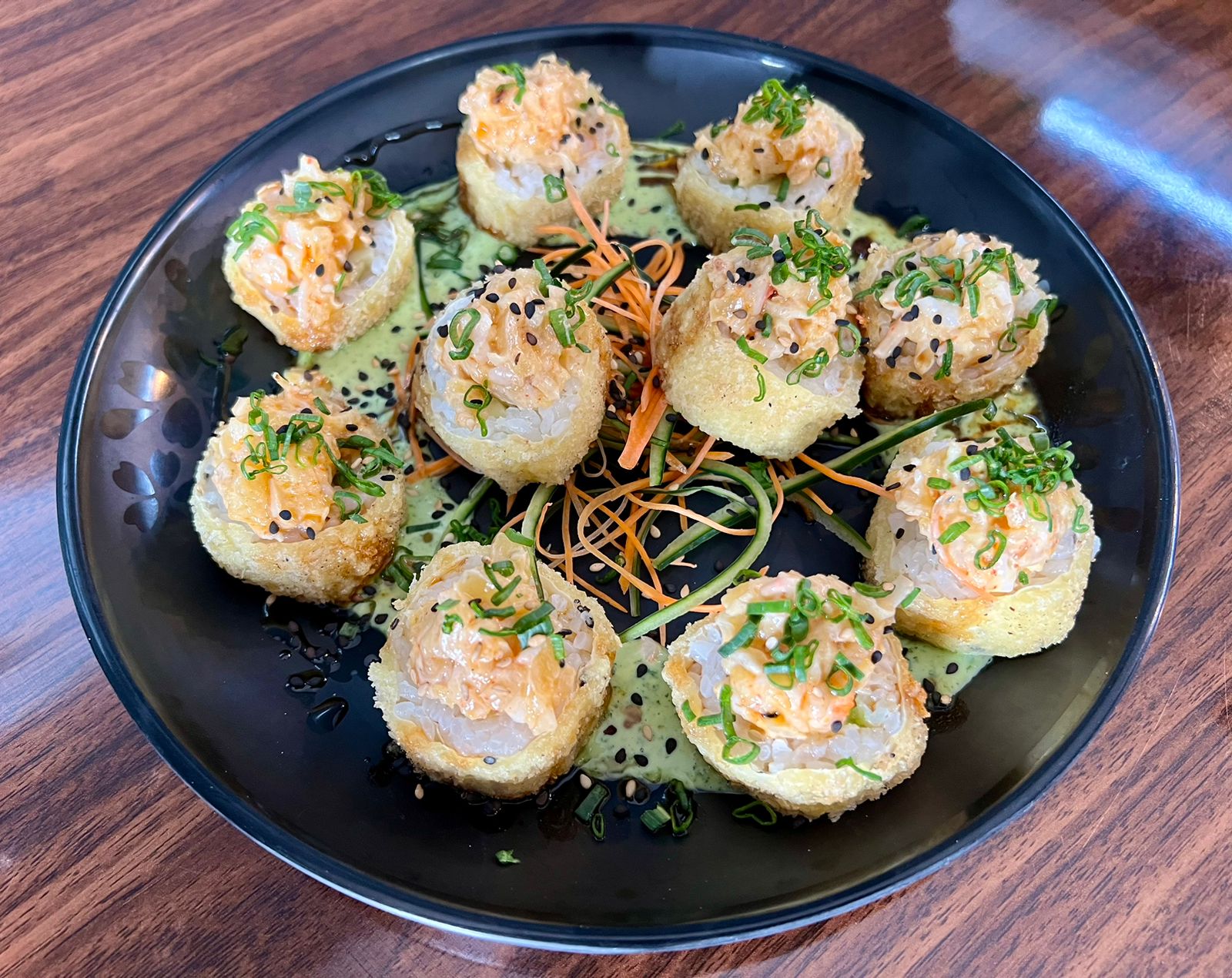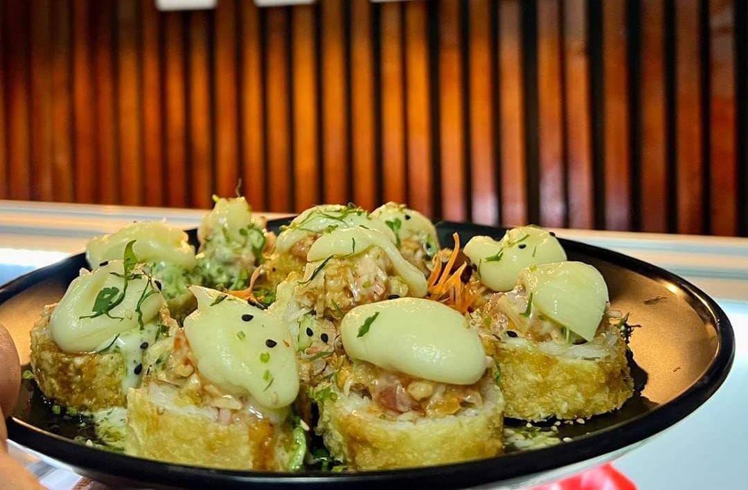 Rollo tempura relleno de aguacate, pepino, queso crema y pescado. Por fuera cangrejo frito, salsa cilantro y yuzu. Acompañado de spicy, chiles toreados con soya y soya.