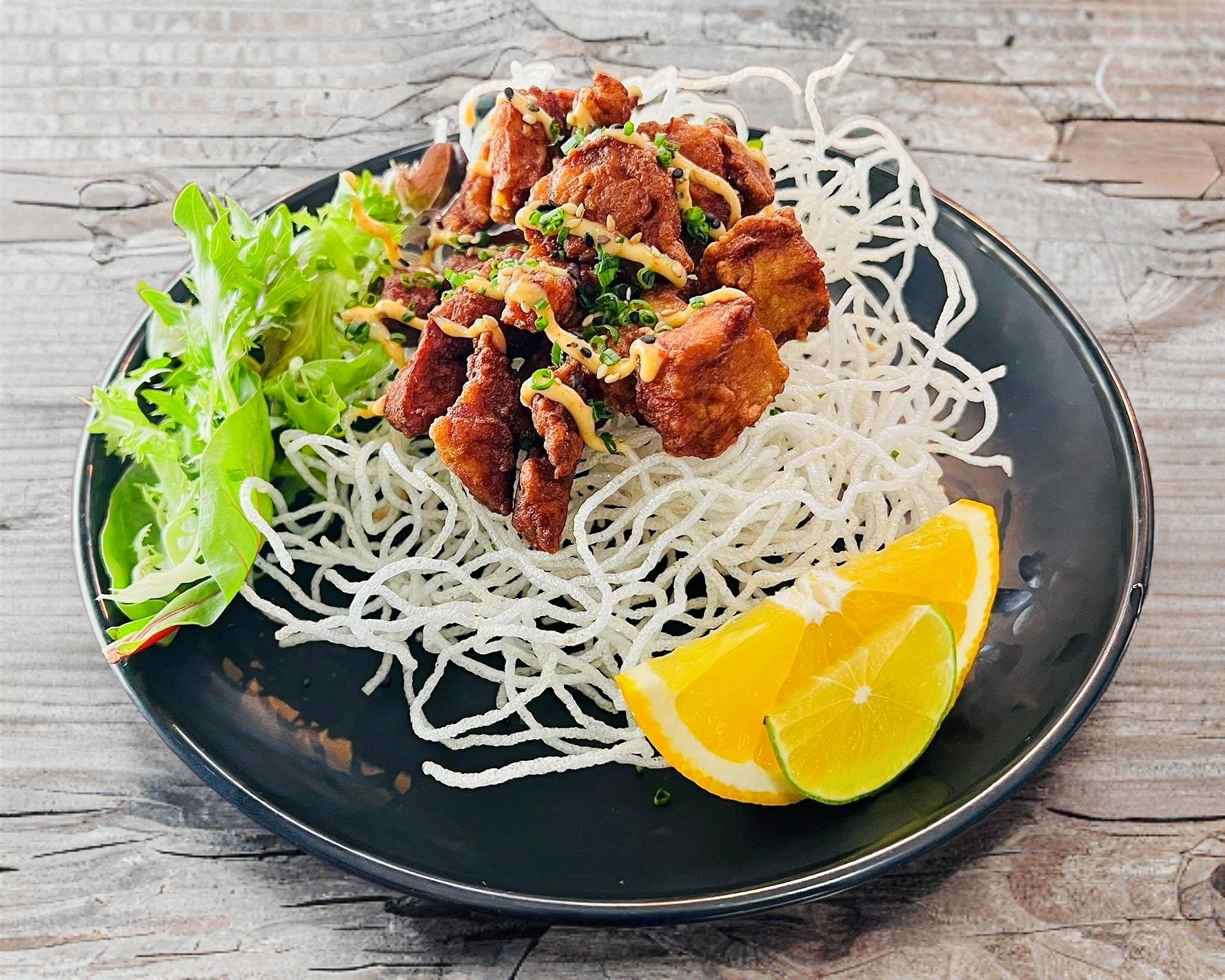 Cuadros de pescado sazonados con soya y harina de papa. Bañado en aceite curry y ponzu.